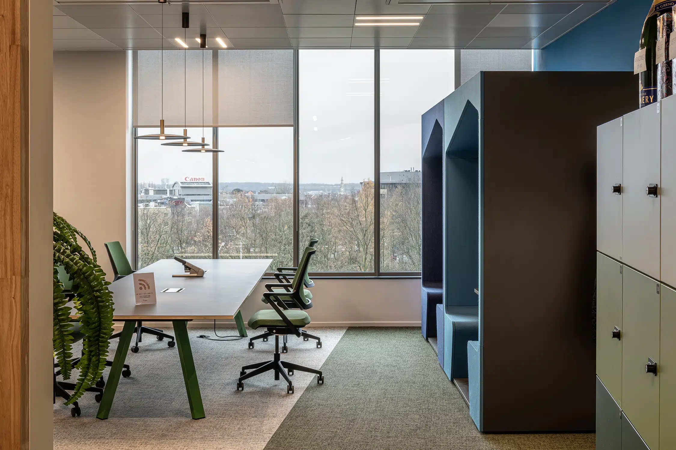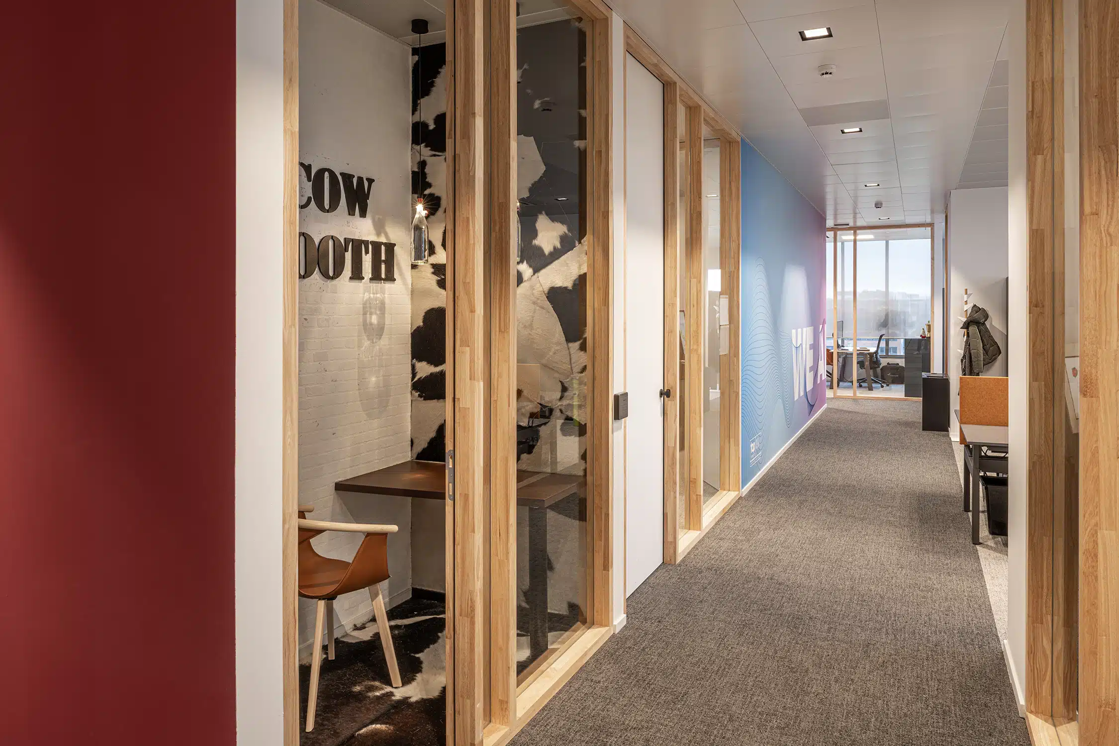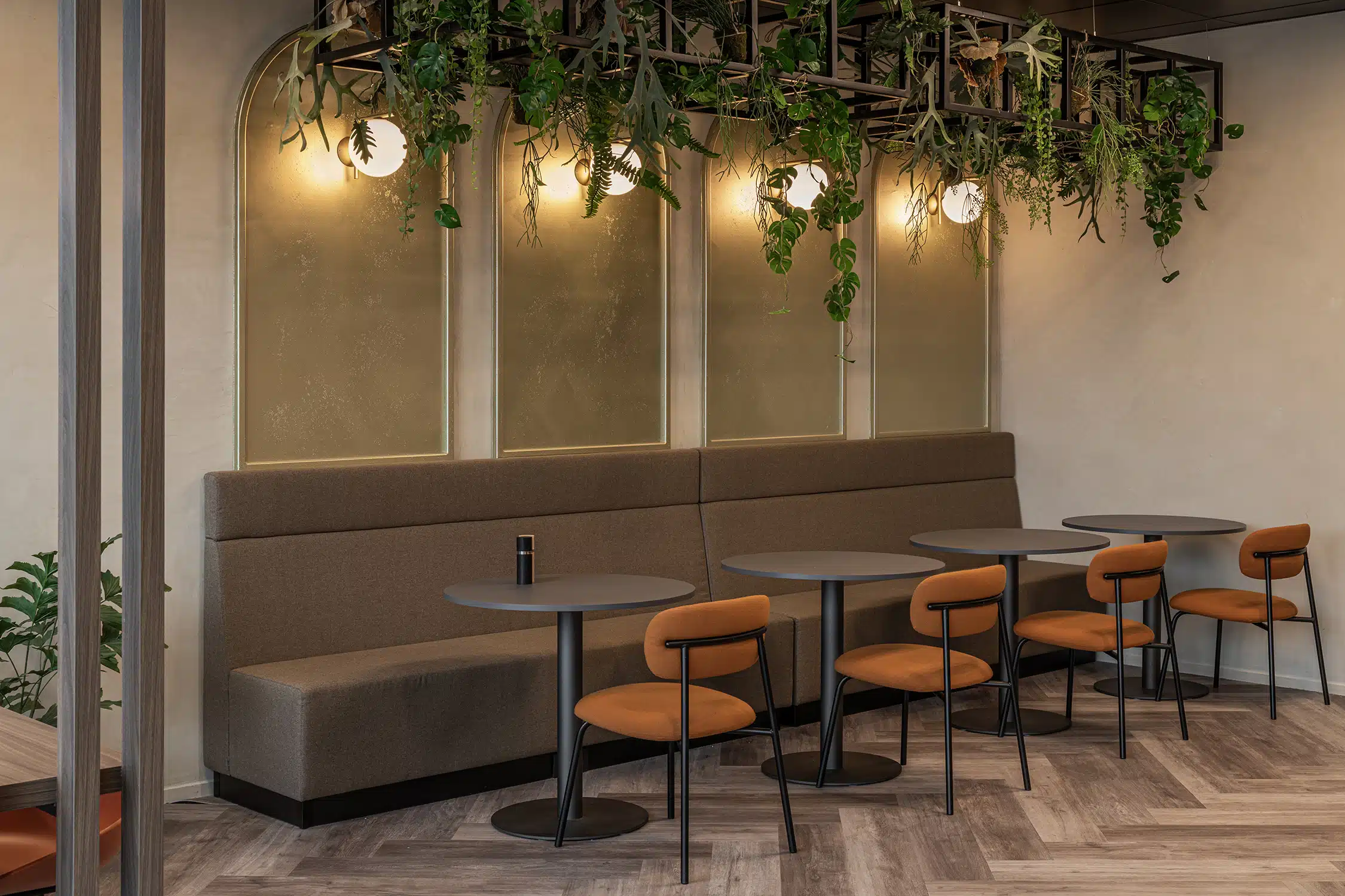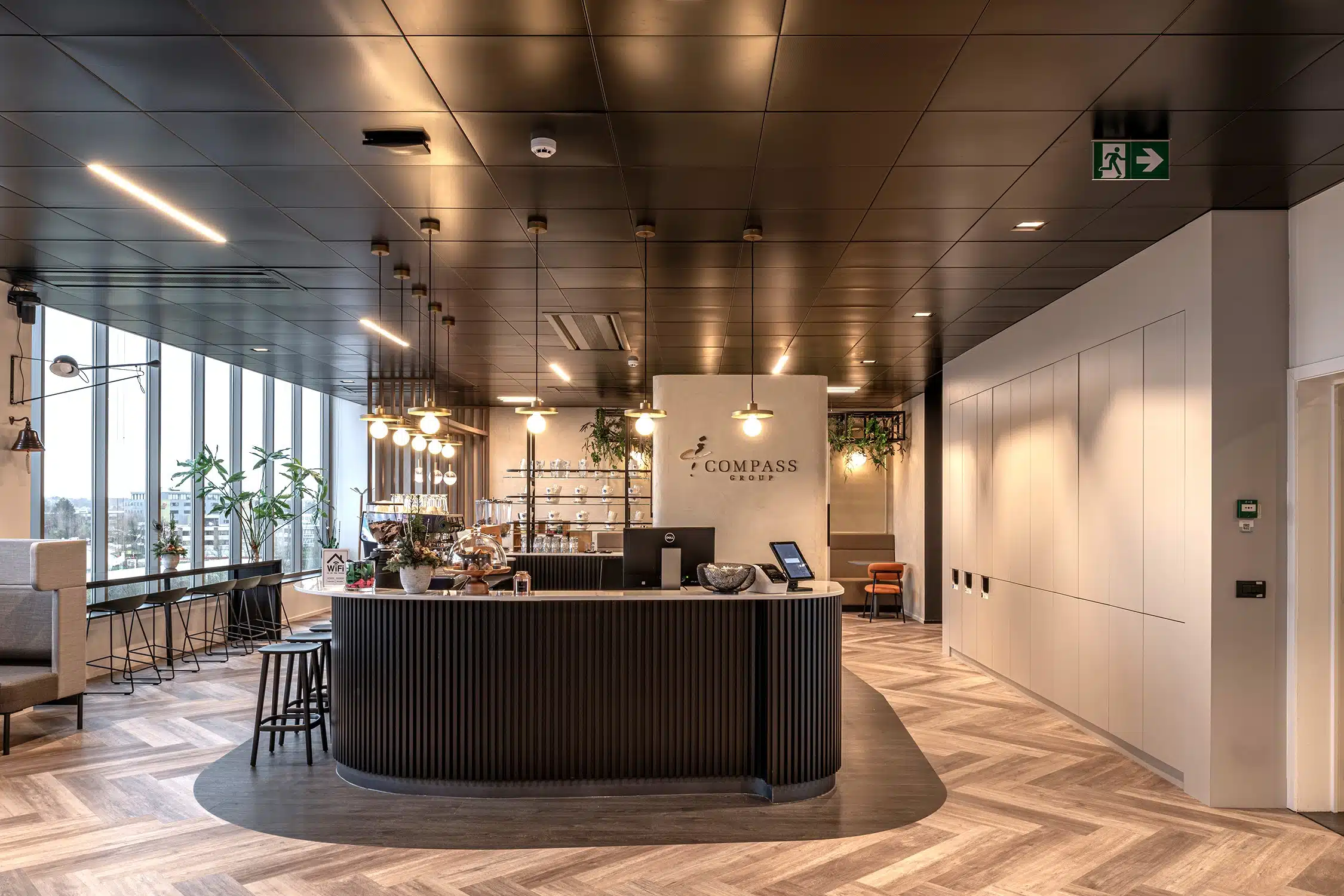 Wij hebben getracht om het kantoor een eigen ziel te geven met subtiele verwijzingen naar de cateringactiviteiten en de waarden die Compass hanteert. Daarbij springen de gethematiseerde vergaderruimtes in het oog alsook de op maat ontworpen phone booths. We wouden geen steriele kantoorruimte, daarom onze keuze voor warme neutrale materialen en kleurtinten met hier en daar een fris kleuraccent.