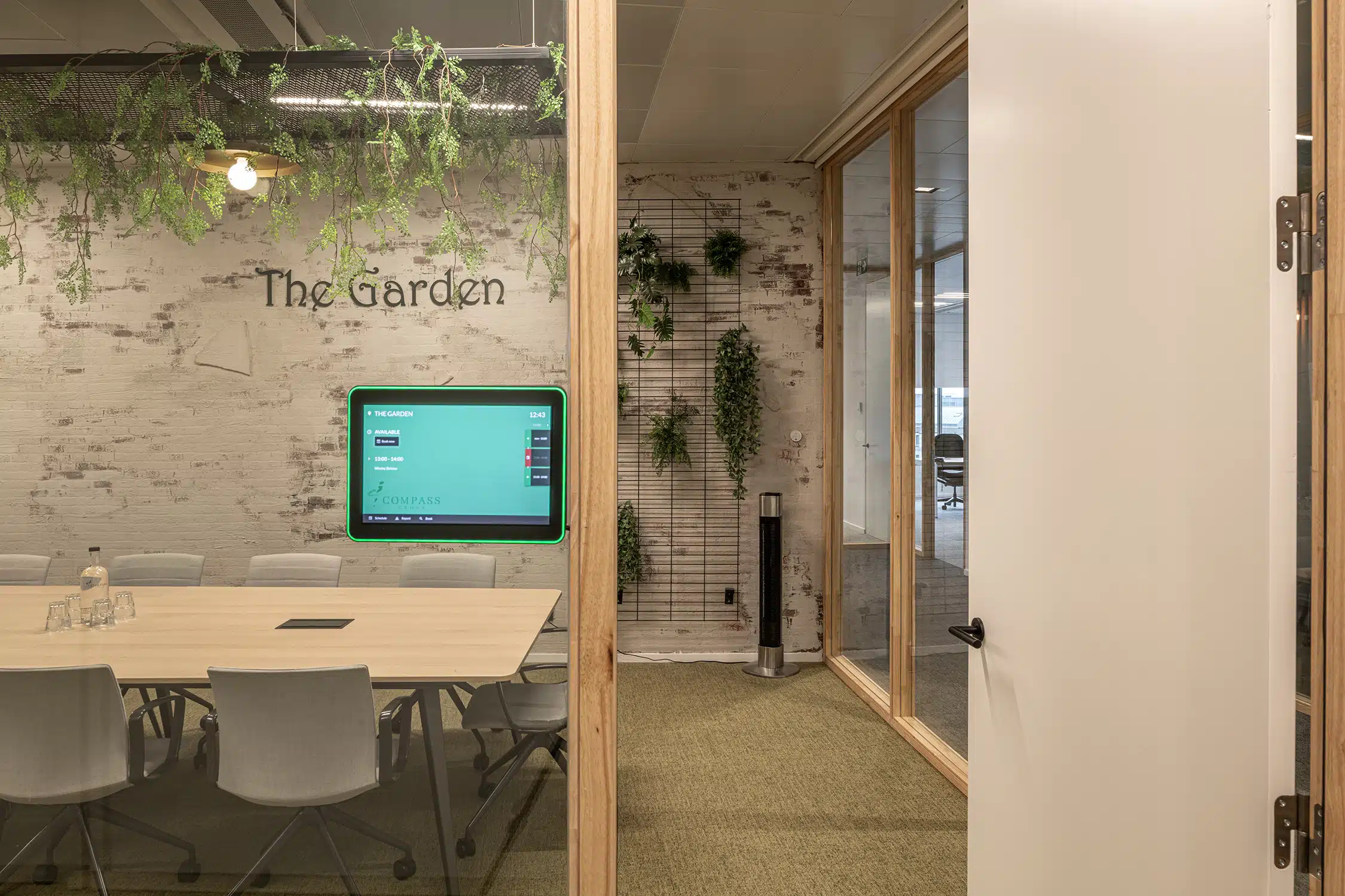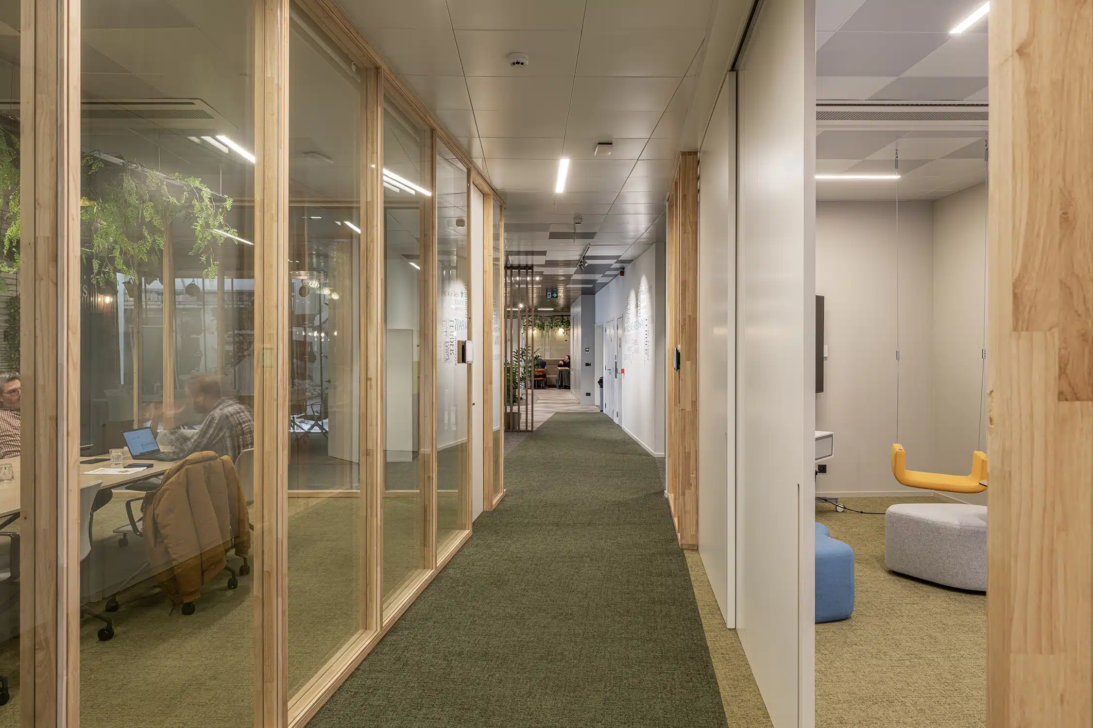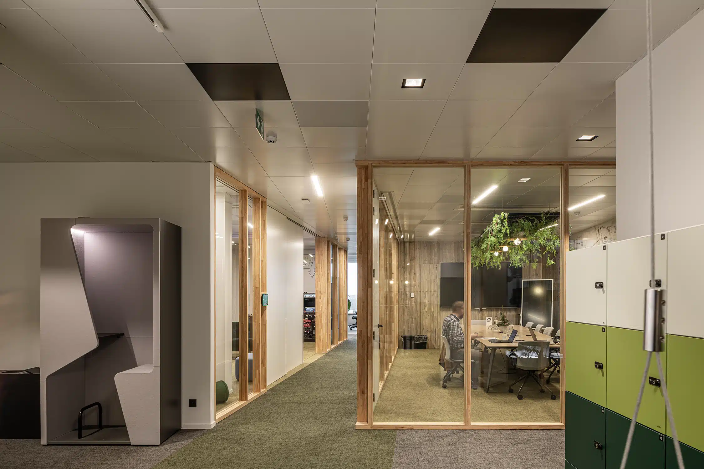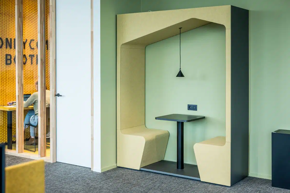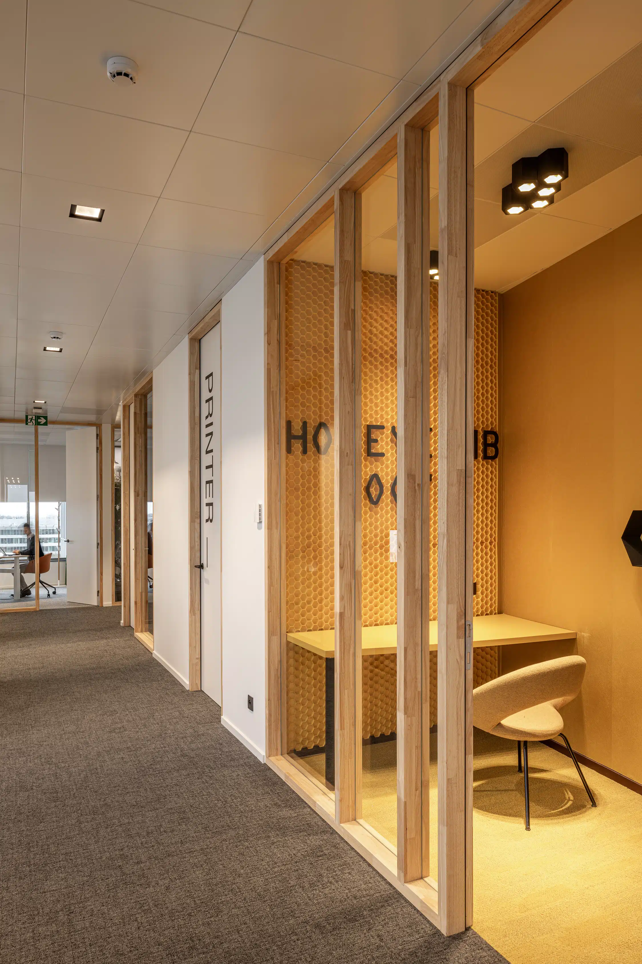 Wij hebben getracht om het kantoor een eigen ziel te geven met subtiele verwijzingen naar de cateringactiviteiten en de waarden die Compass hanteert. Daarbij springen de gethematiseerde vergaderruimtes in het oog alsook de op maat ontworpen phone booths. We wouden geen steriele kantoorruimte, daarom onze keuze voor warme neutrale materialen en kleurtinten met hier en daar een fris kleuraccent.