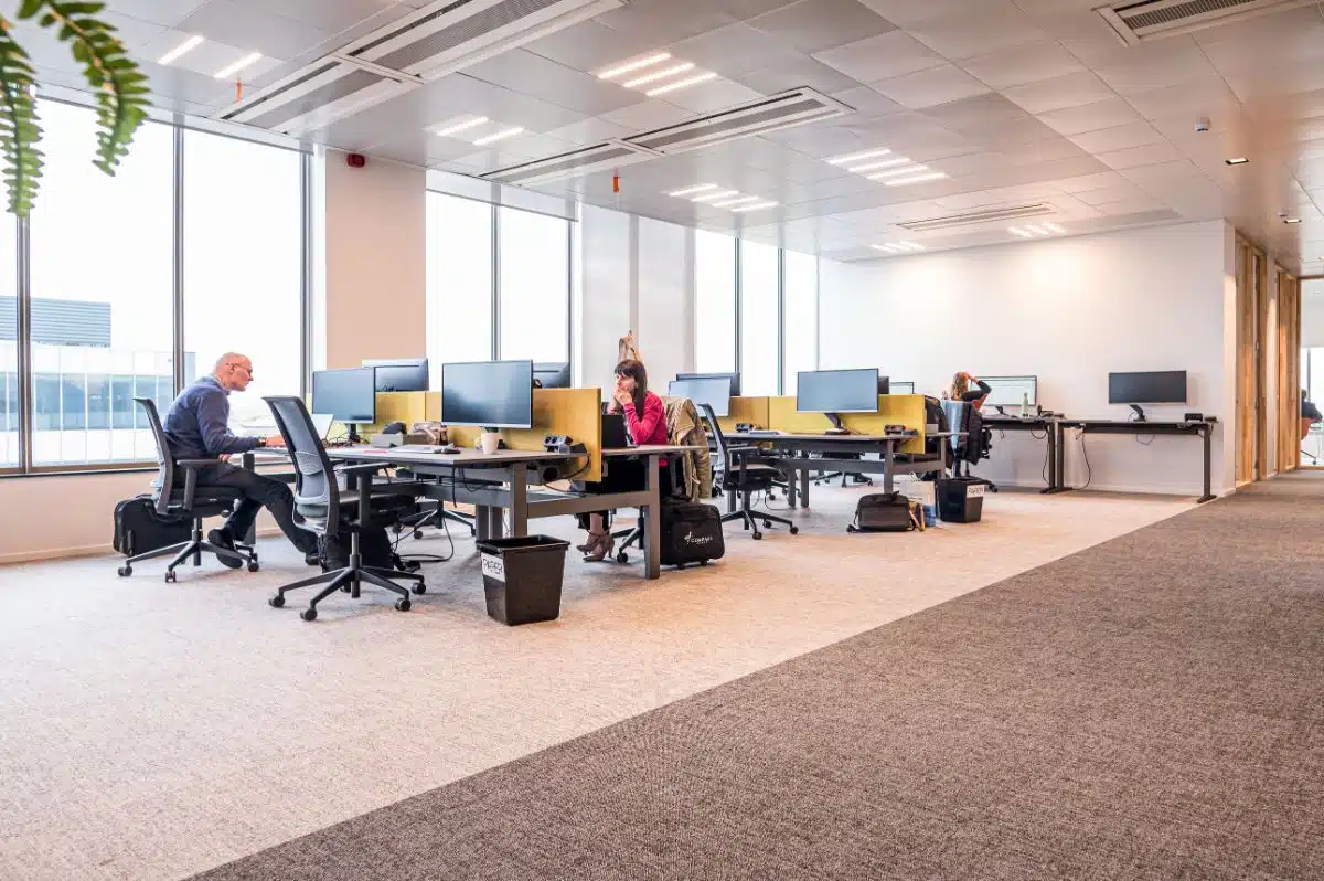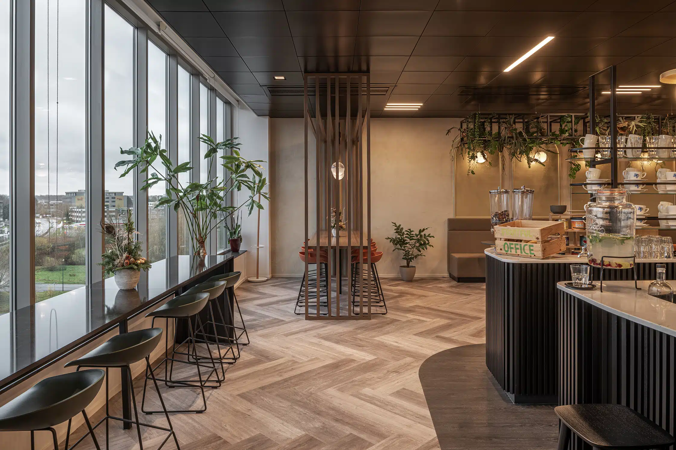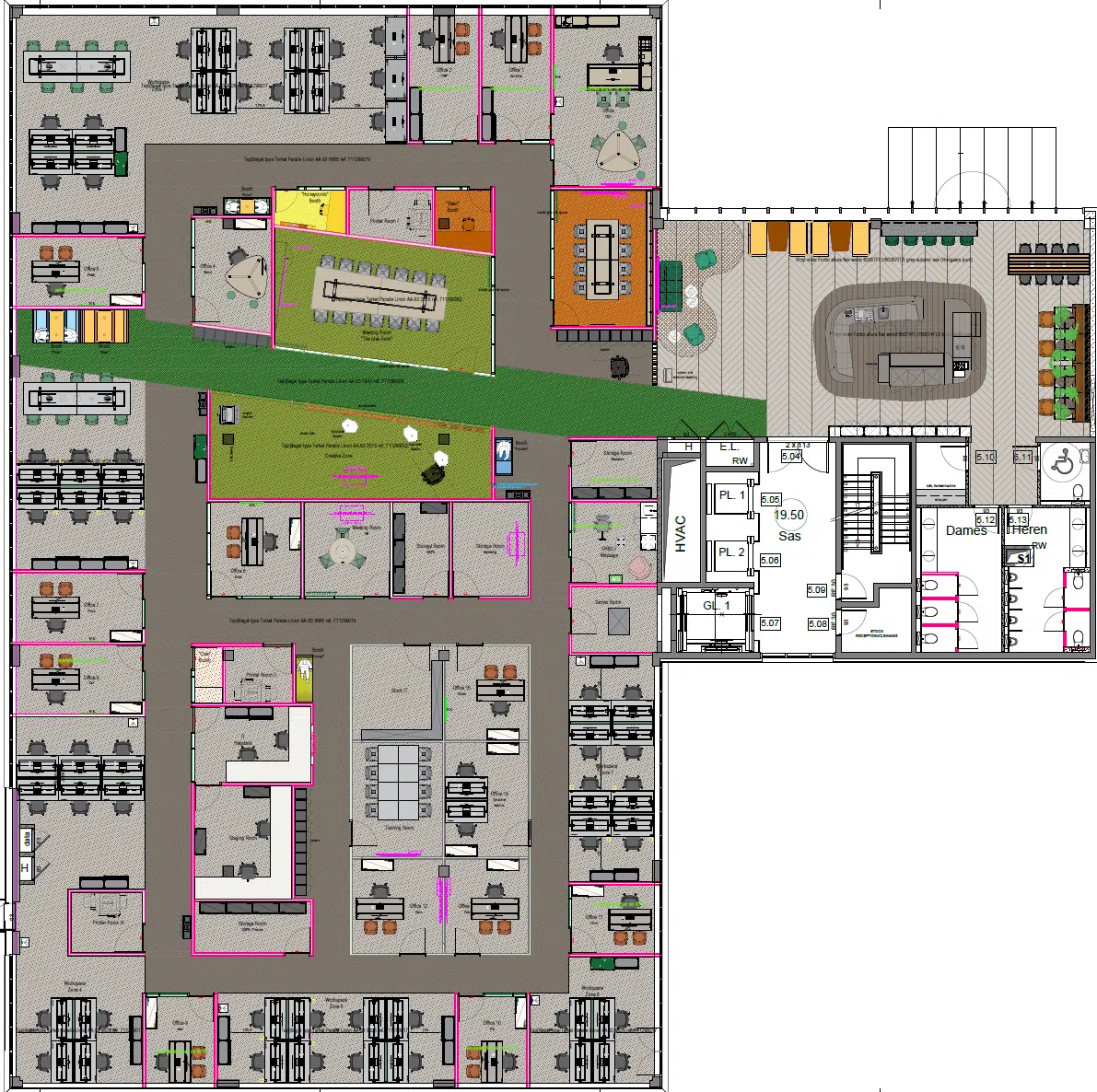 Het ruimte hebben wij in twee zones ingedeeld, enerzijds een hospitality ruimte met barista bar welke ook dienst doet als receptie, een wacht- en eetzone en anderzijds een werkzone van 1000m² met werkeilanden en kantoren die genietien van een panoramisch uitzicht, overleg ruimtes met halfopen booths, vergaderzalen, concentratiezones…