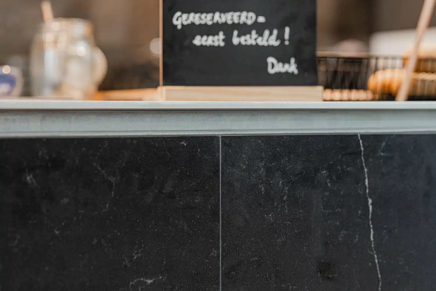 Deze kleine “grootkeuken” met compacte uitgifte gaven we massa door gebruik te maken van donkere materialen zoals zwarte zelliges en donkere natuursteen. De esthetische elegantie van de gekozen steen “Et Noir” komt uit het gamma Eternal van Siletone. Bossuyt Grootkeukens nam de installatie van de keukentoestellen op zich en voorzag de uitgiftetoog van een dik massief roestvrijstalen bovenblad met geborstelde afwerking.