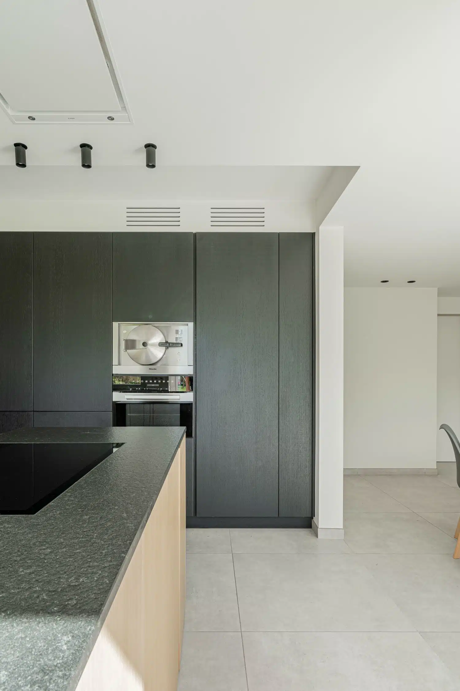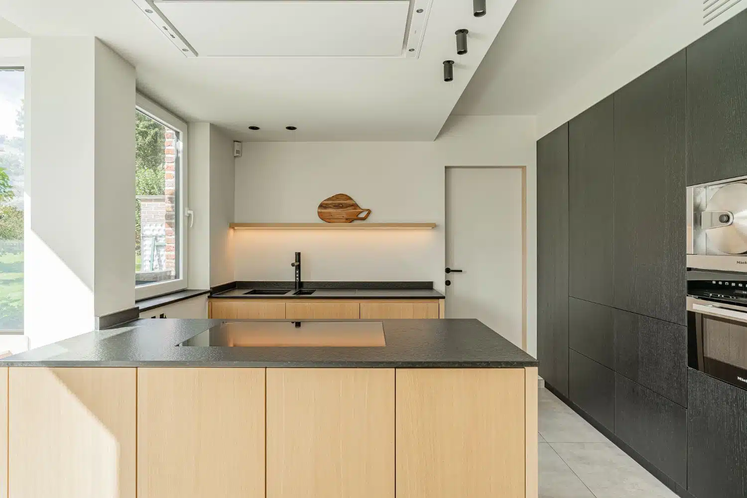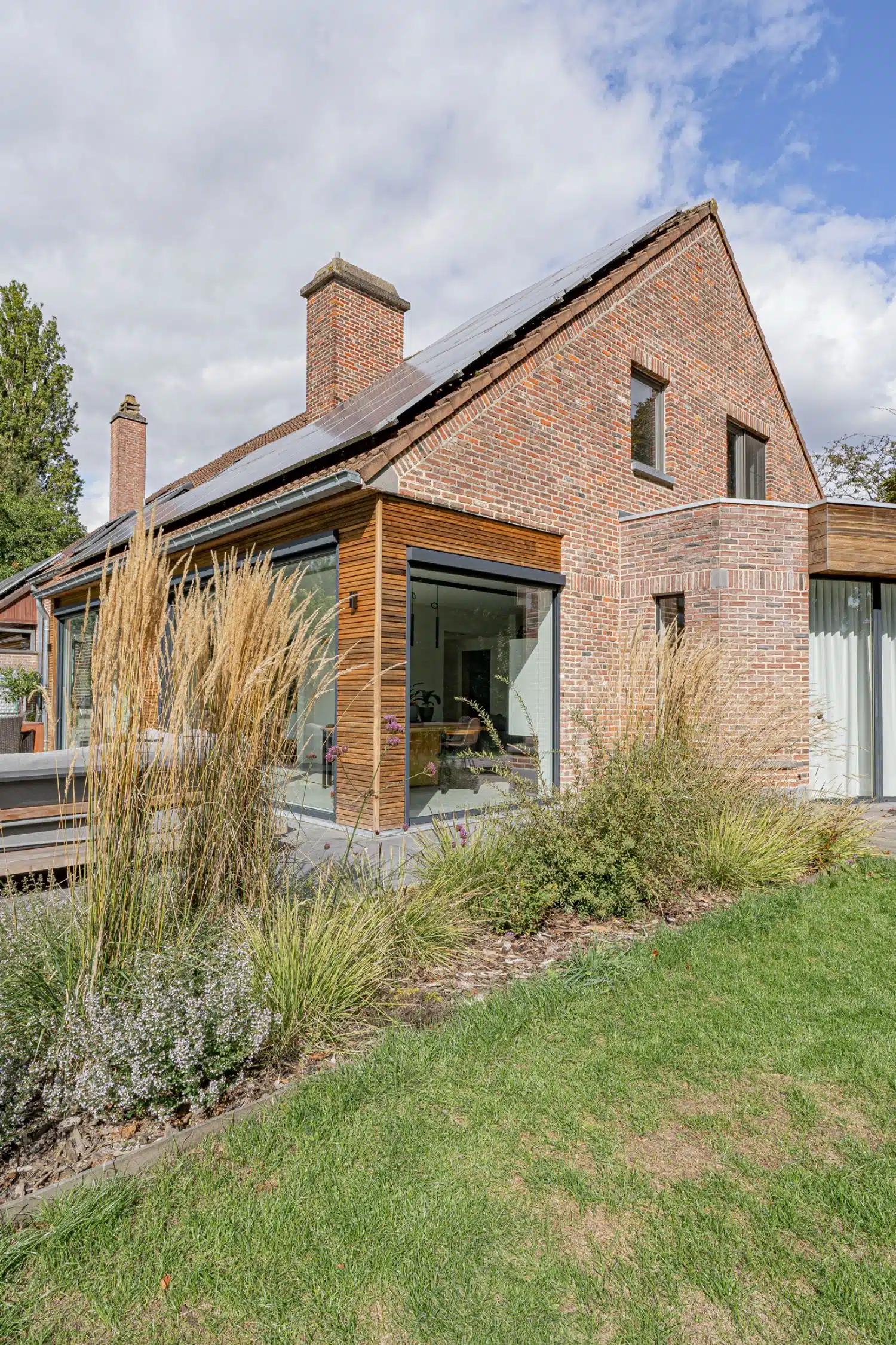 Soms mag het iets meer zijn, interieurarchitect Peter Roekens pakte deze woning stevig aan. De halfopen bebouwing in Dilbeek werd aan de achterzijde volledig opengewerkt om zo maximaal het binnen buiten gevoel te versterken. Zowel de keuken, eetkamer en zithoek kijken voortaan uit op de nieuwe aangelegde tuin met groot terras. Ook het interieur namen wij onder handen maar hier lag de focus op comfort, alle dekvloeren werden uitgebroken om zo te voorzien in een nieuwe vloerverwarming, er werd een lichtplan opgemaakt en de keuken werd heringedeeld. Het interieur heeft een open luchtig gevoel met veel licht. En er is een subtiel contrast tussen lichte en donkere houtaccenten.