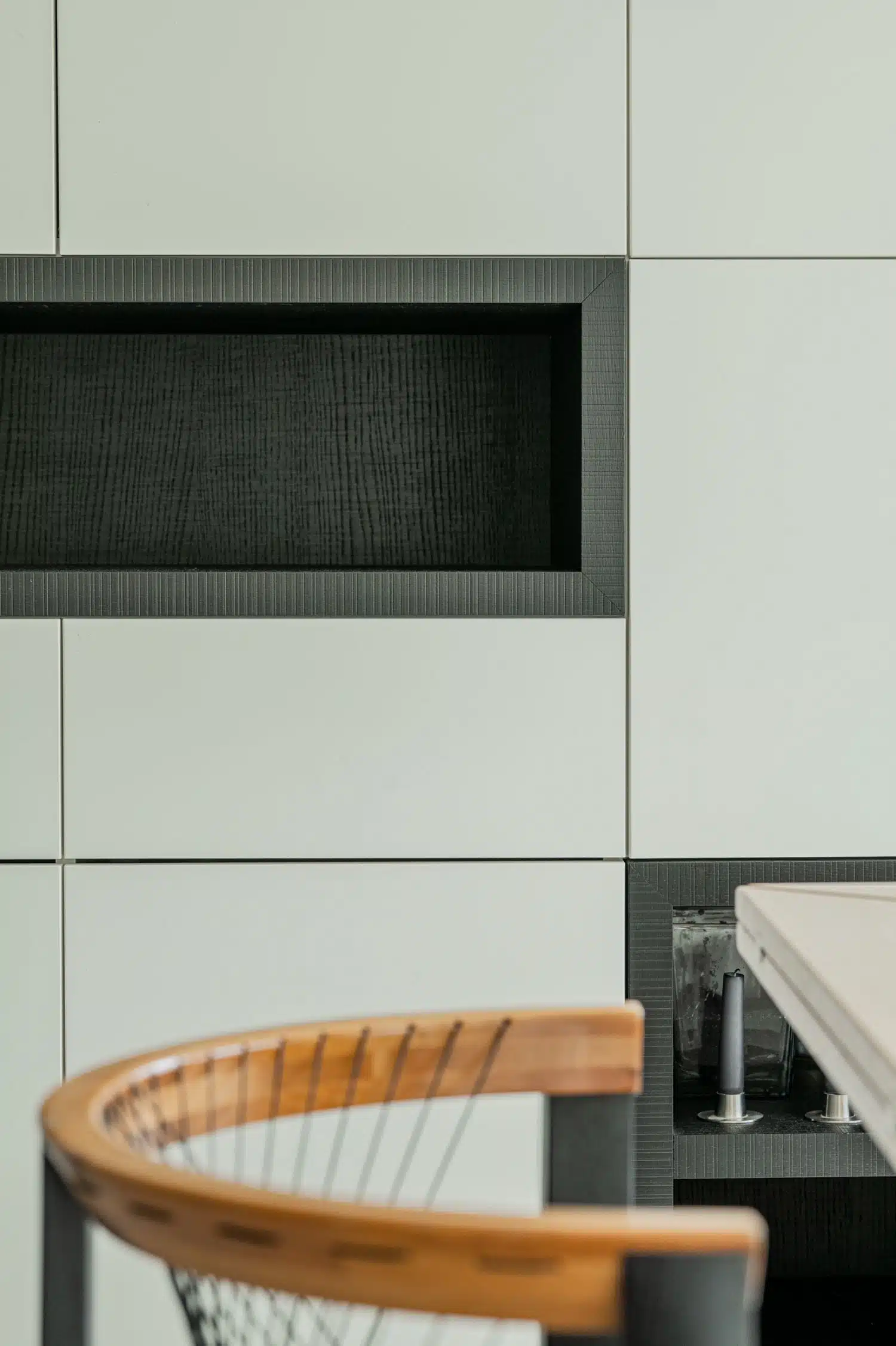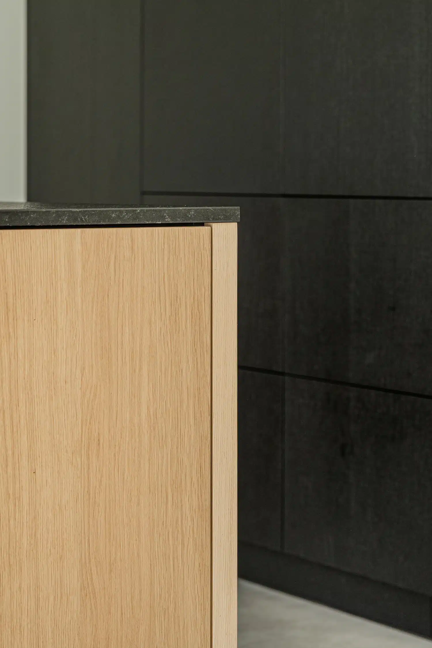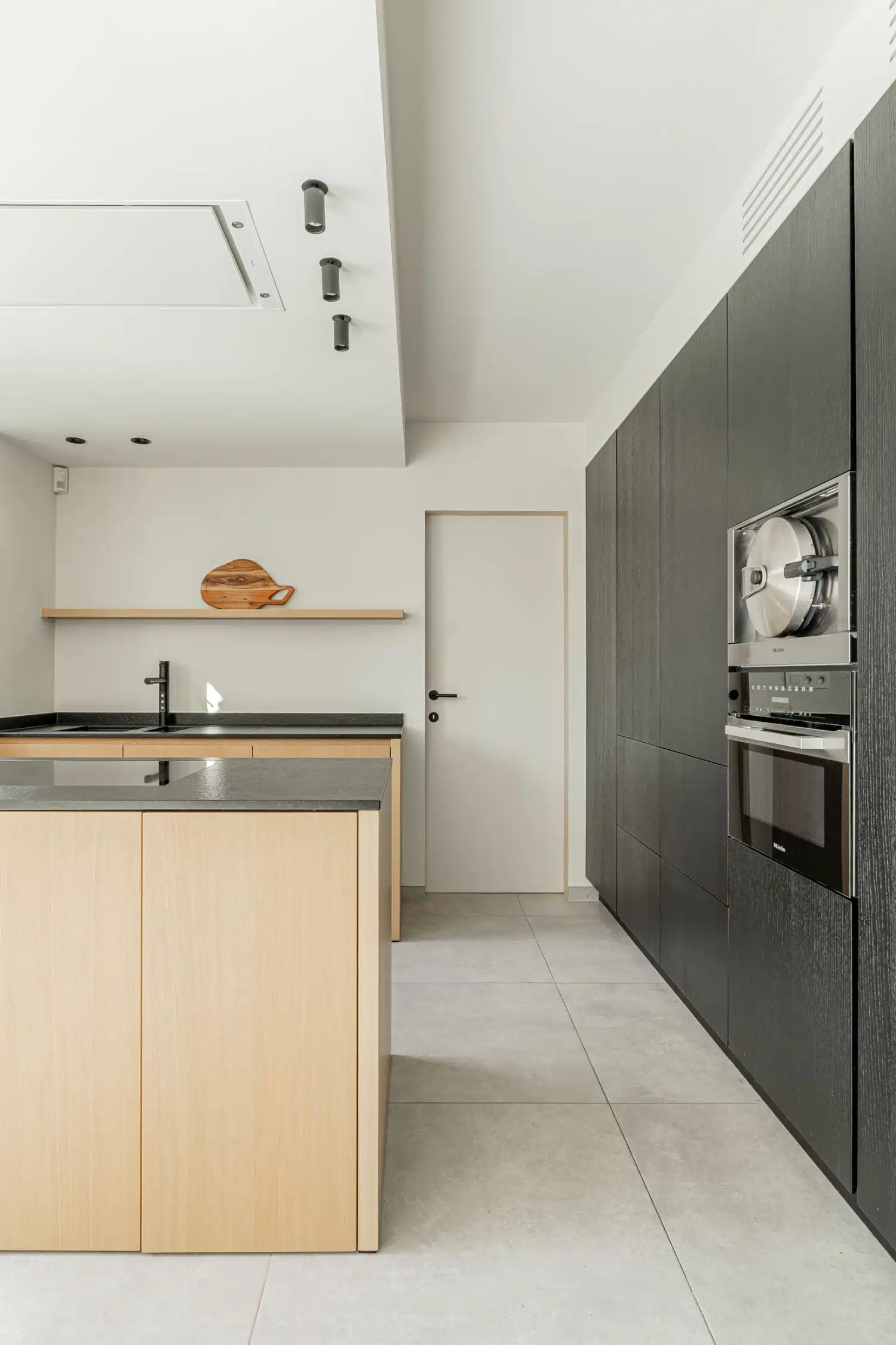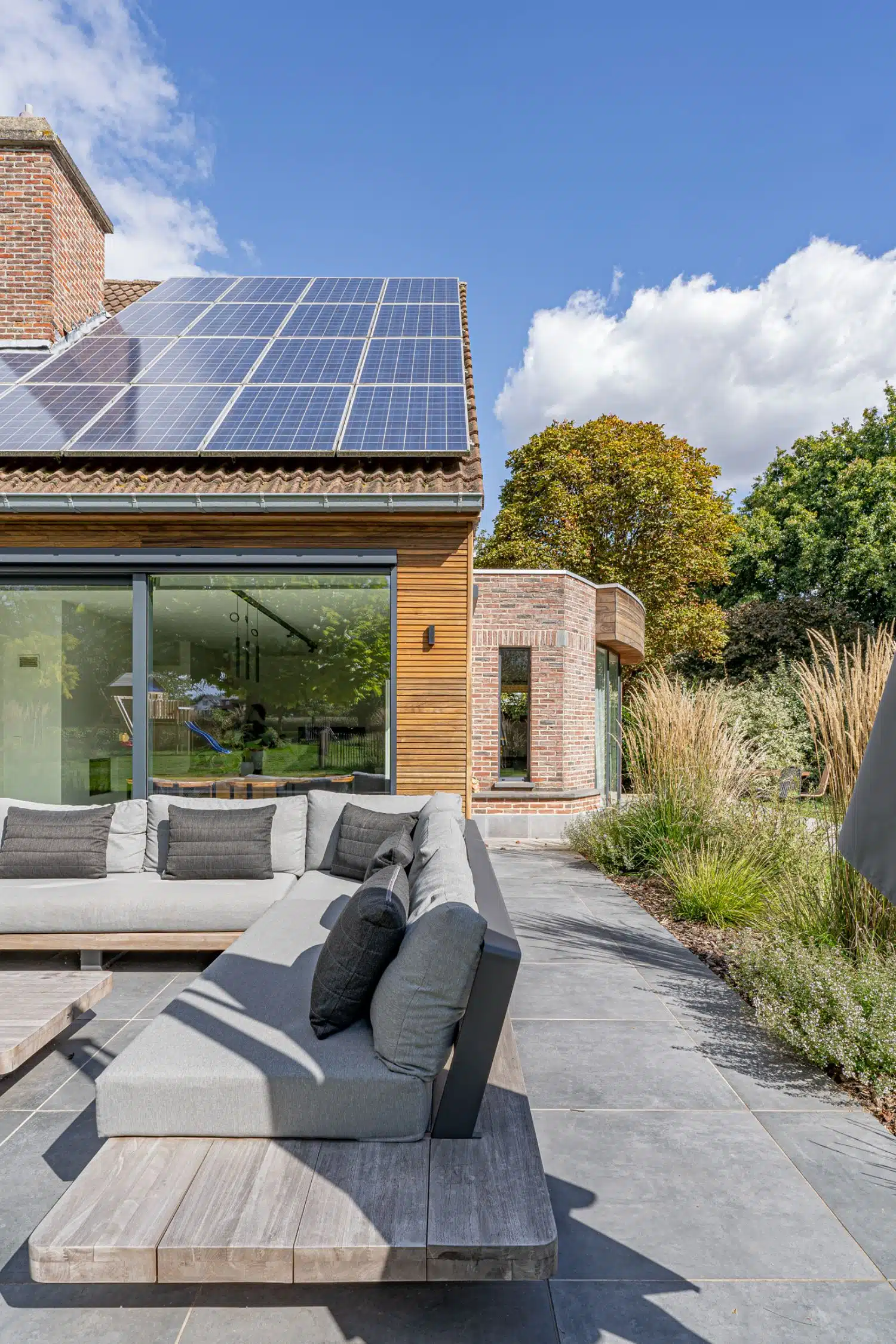 Soms mag het iets meer zijn, interieurarchitect Peter Roekens pakte deze woning stevig aan. De halfopen bebouwing in Dilbeek werd aan de achterzijde volledig opengewerkt om zo maximaal het binnen buiten gevoel te versterken. Zowel de keuken, eetkamer en zithoek kijken voortaan uit op de nieuwe aangelegde tuin met groot terras. Ook het interieur namen wij onder handen maar hier lag de focus op comfort, alle dekvloeren werden uitgebroken om zo te voorzien in een nieuwe vloerverwarming, er werd een lichtplan opgemaakt en de keuken werd heringedeeld. Het interieur heeft een open luchtig gevoel met veel licht. En er is een subtiel contrast tussen lichte en donkere houtaccenten.