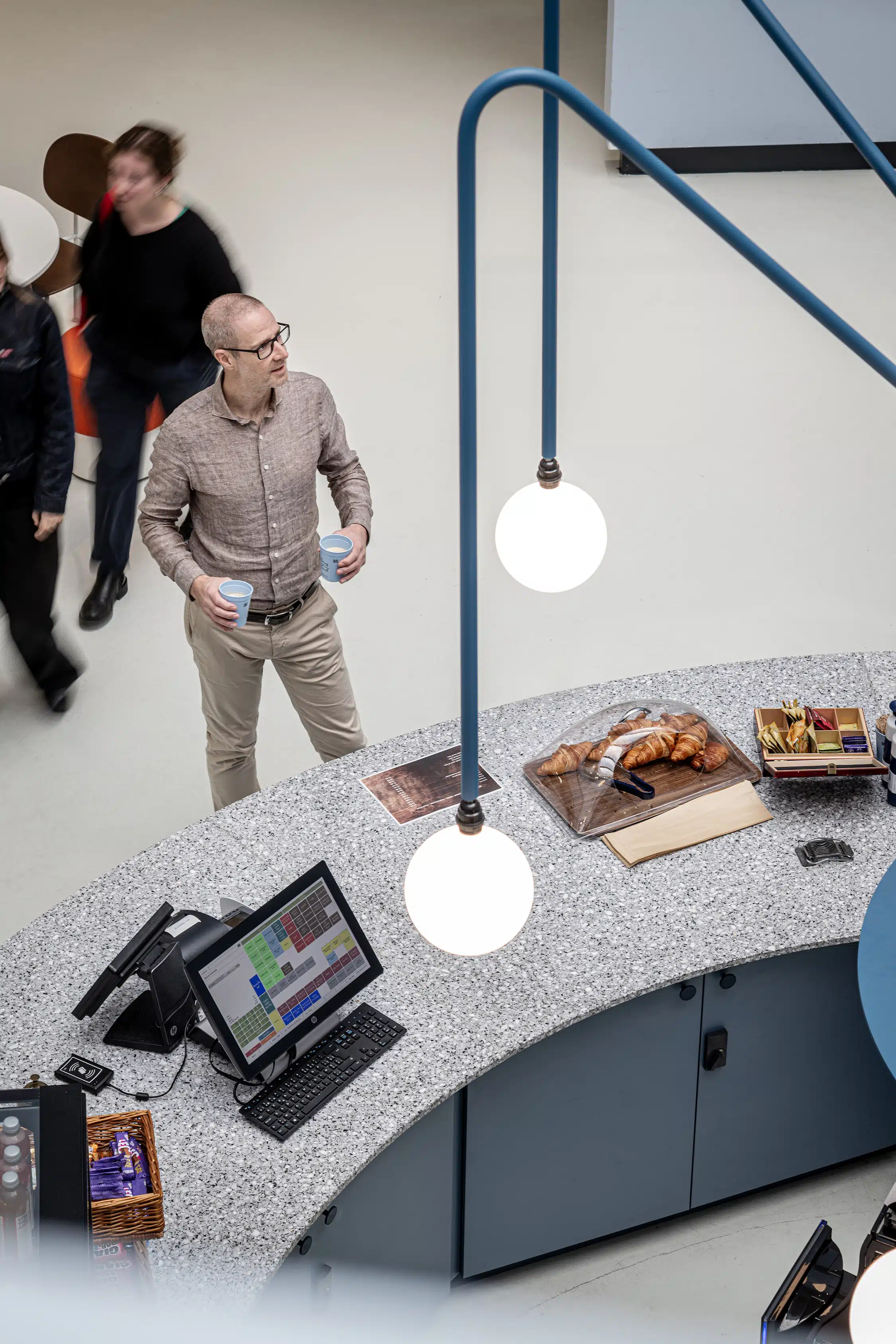 De bar is niet zomaar een meubel maar is een verlengstuk van de bestaande architectuur. De ronde vorm van de bar gaat een directe synergie aan met de cirkelvormige lijnen van het atrium waardoor het de koffiebar organisch opgaat in de ruimte. De nadruk ligt hierbij op openheid en licht. Dankzij de ligging centraal in het atrium profiteert de koffiebar van natuurlijk zenitaal licht via de lichtkoepel.