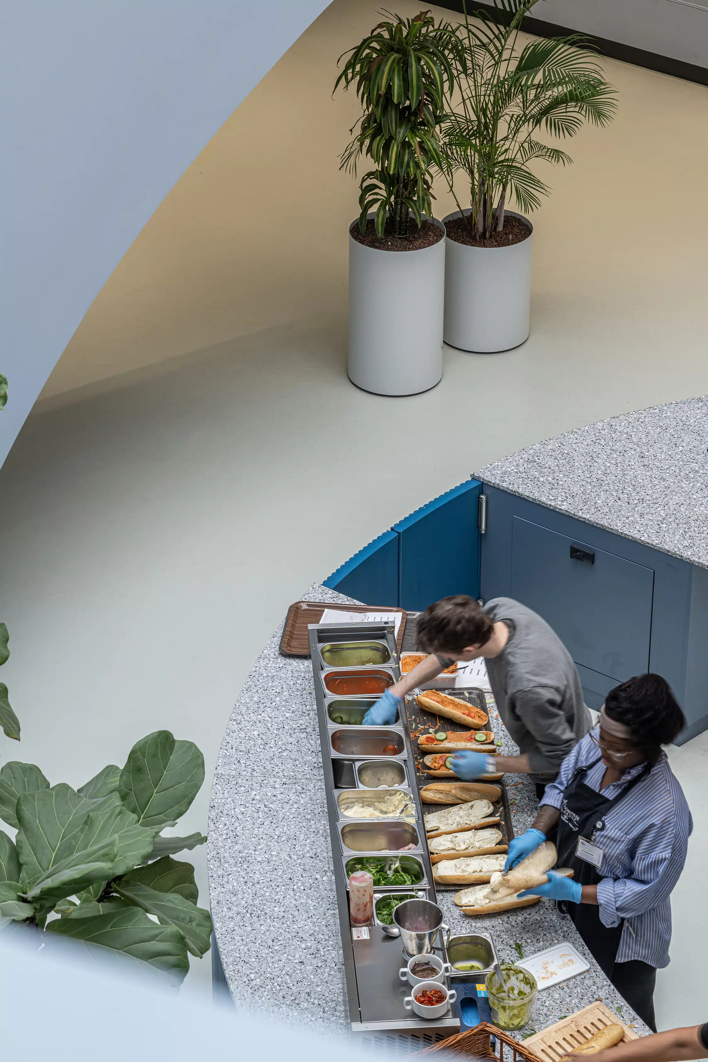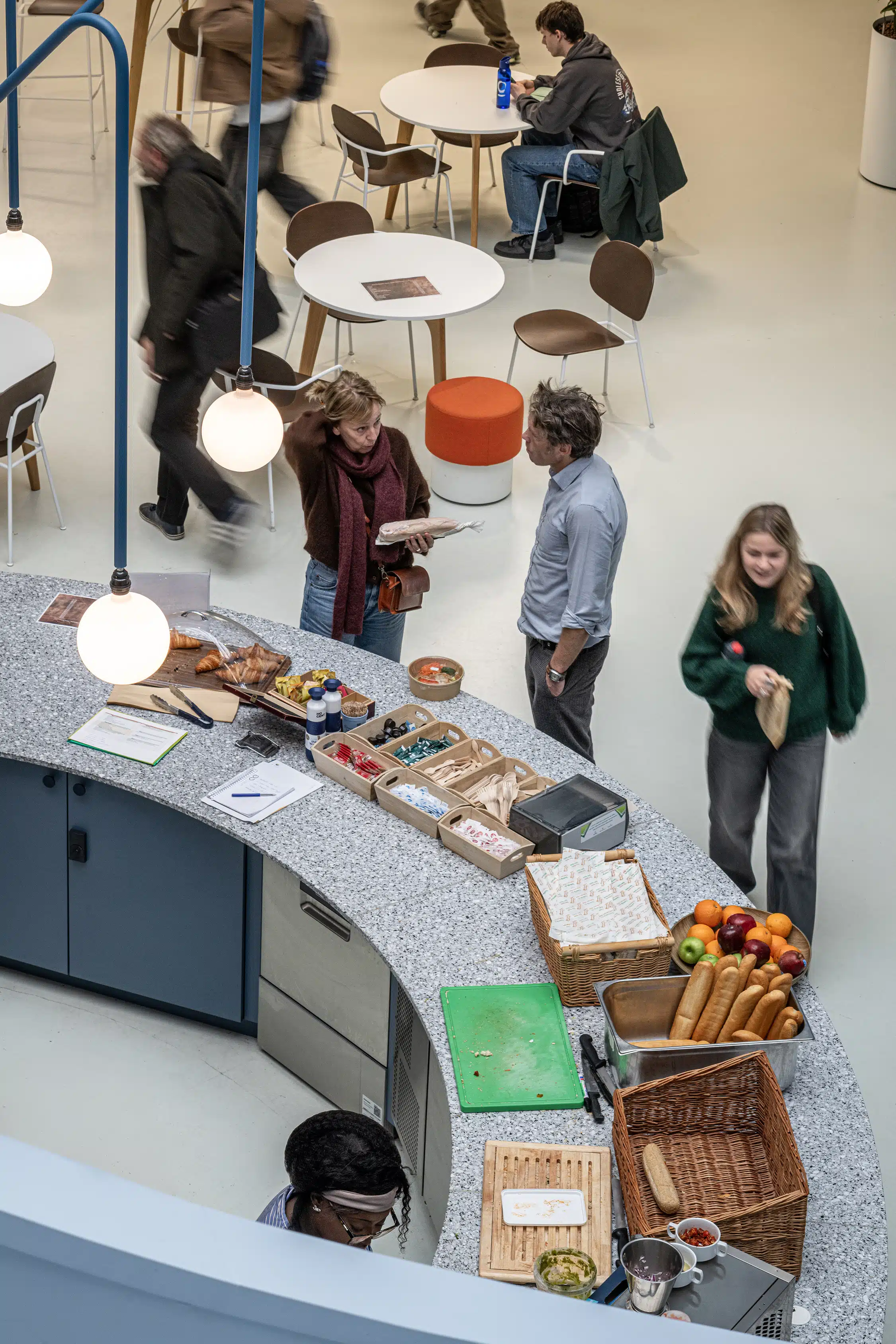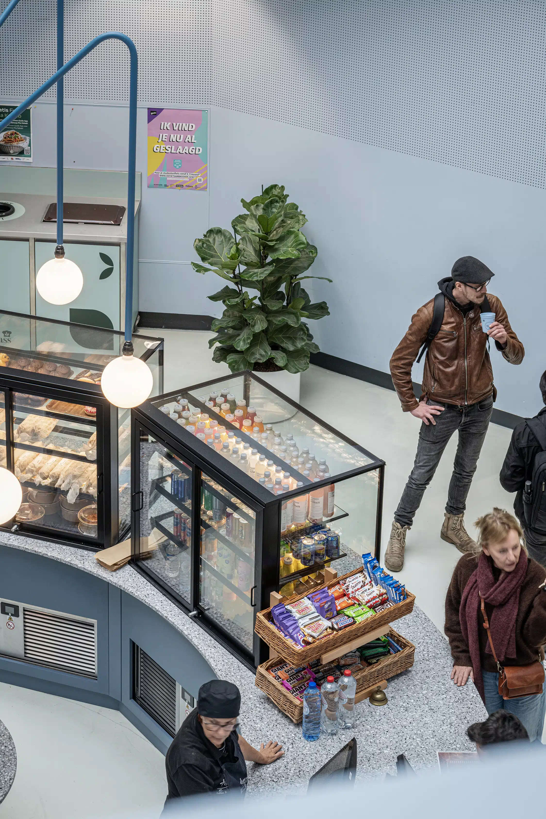 In deze bar draait alles om beleving en transparantie. Terwijl klanten wachten op hun versgezette, kwaliteitsvolle koffie, kunnen ze zien hoe hun broodjes ter plaatse en voor het oog van de klant worden bereid. Deze centrale opstelling creëert een overzichtelijke organische flow.