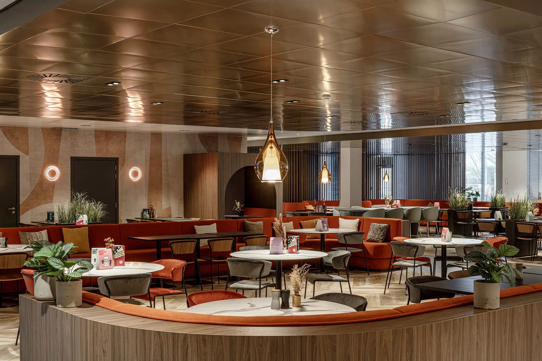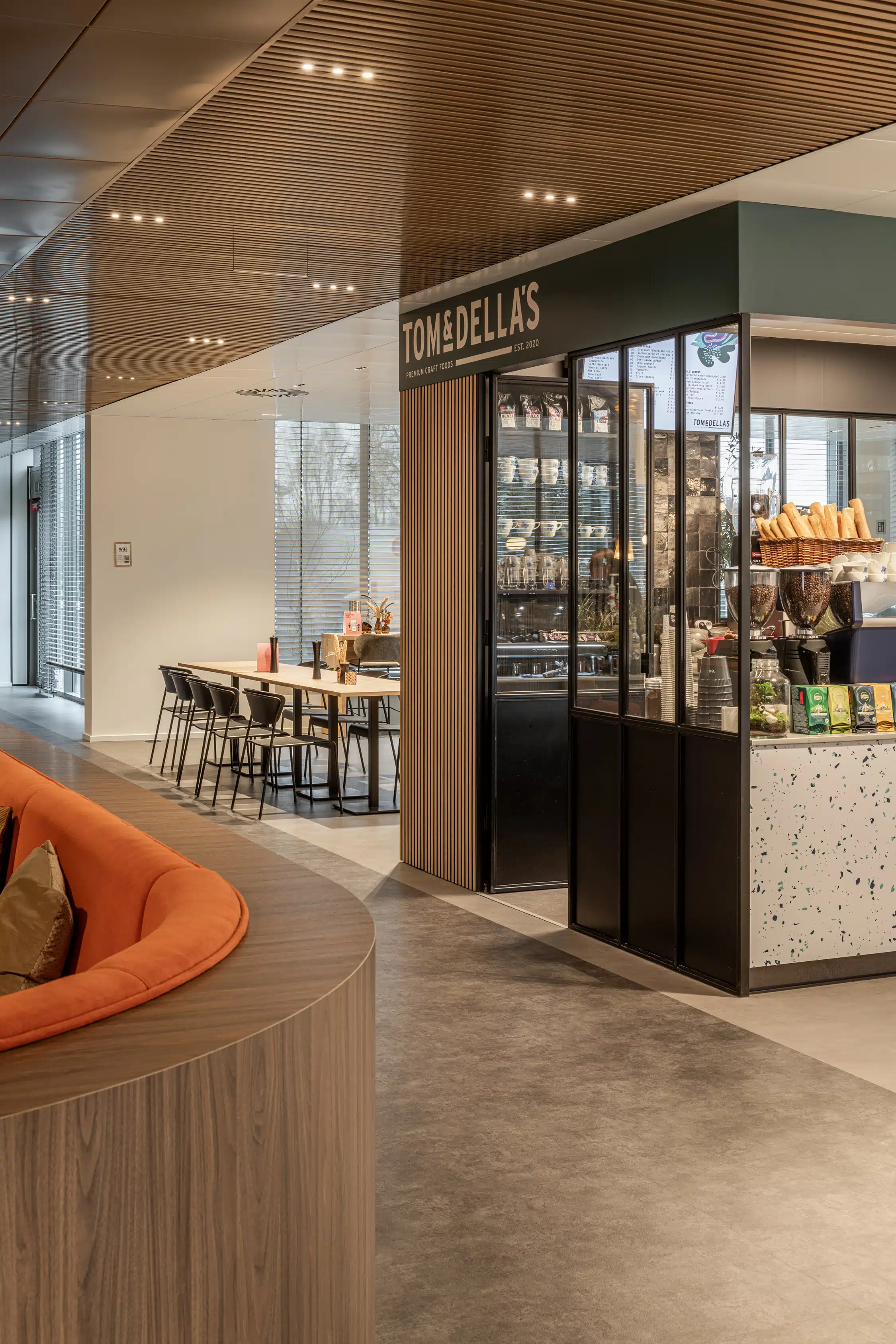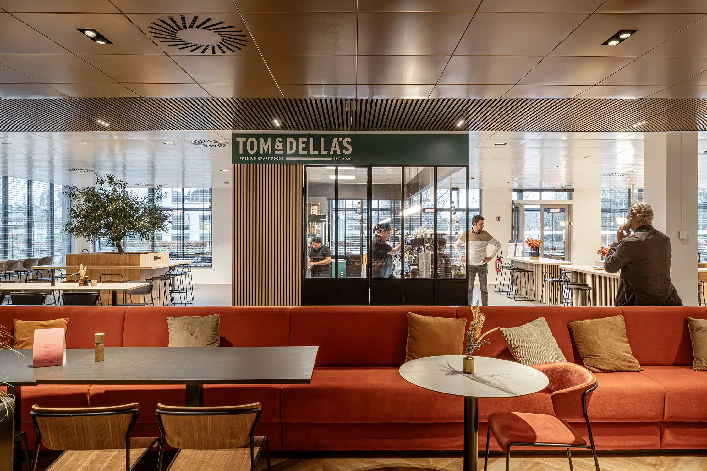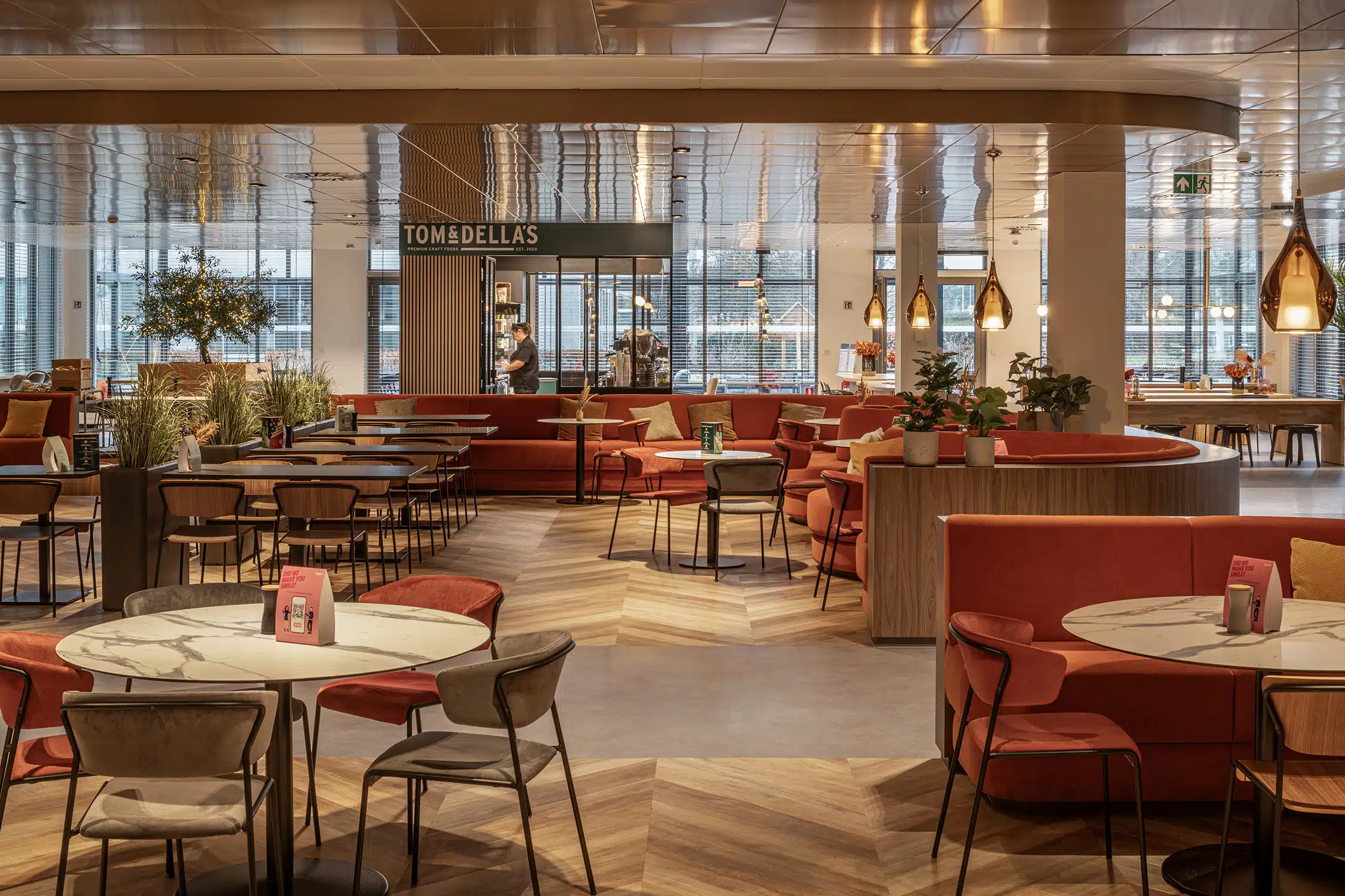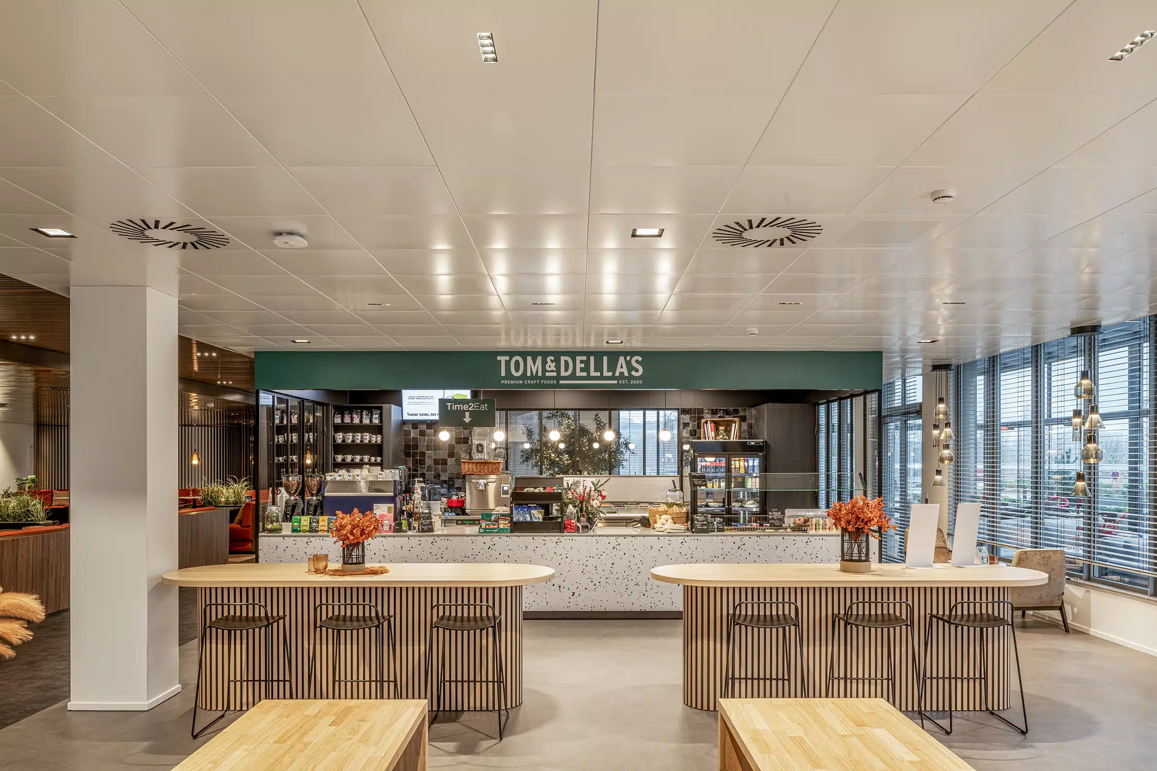 In het kantorencomplex “Hermes Plaza” werd de bestaande kantine opgewaardeerd tot een gezellig restaurant met Tom&Della’s koffiebar concept. De eerste zone grenzend aan de wintertuin is luchtig door de vele raampartijen en door gebruik van lichte houtsoorten en de toepassing van een wit systeemplafond. Centraal in deze zone staat onze Tom & Della’s koffiebar, een nieuw concept van Compass Group die wij mochten vormgeven. Aansluitend ontwierpen we een restaurant dat polyvalent gebruik omarmt, deze biedt een dynamische ervaring die verder gaat dan alleen dineren. Met een verscheidenheid aan zitzones, waaronder comfortabele zitbanken, intieme booths, high en low seating, kunnen gasten de sfeer kiezen die het beste bij hun gelegenheid past. Of het nu gaat om een casual lunch, een zakelijke meeting of een ontspannen koffiepauze, de restaurant zone is ontworpen om aan alle behoeften te voldoen. De toevoeging van goed uitgeruste meeting rooms maakt het restaurant een ideale locatie voor professionele bijeenkomsten, waarbij culinaire genoegens en productiviteit hand in hand gaan. Dit concept van een multifunctioneel restaurant weerspiegelt de hedendaagse trend van flexibele en gemengde ruimtes, waarbij functionaliteit en plezier naadloos samenvloeien.