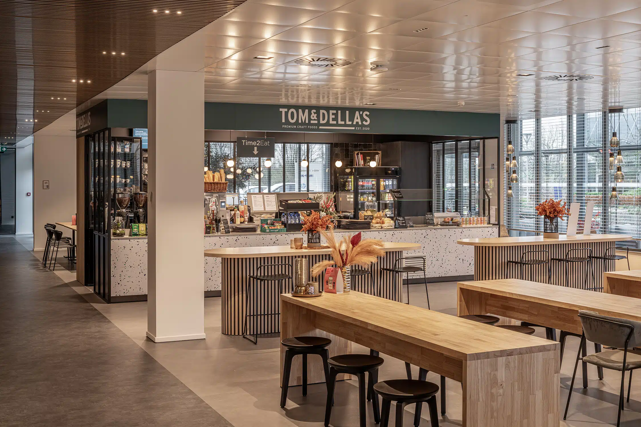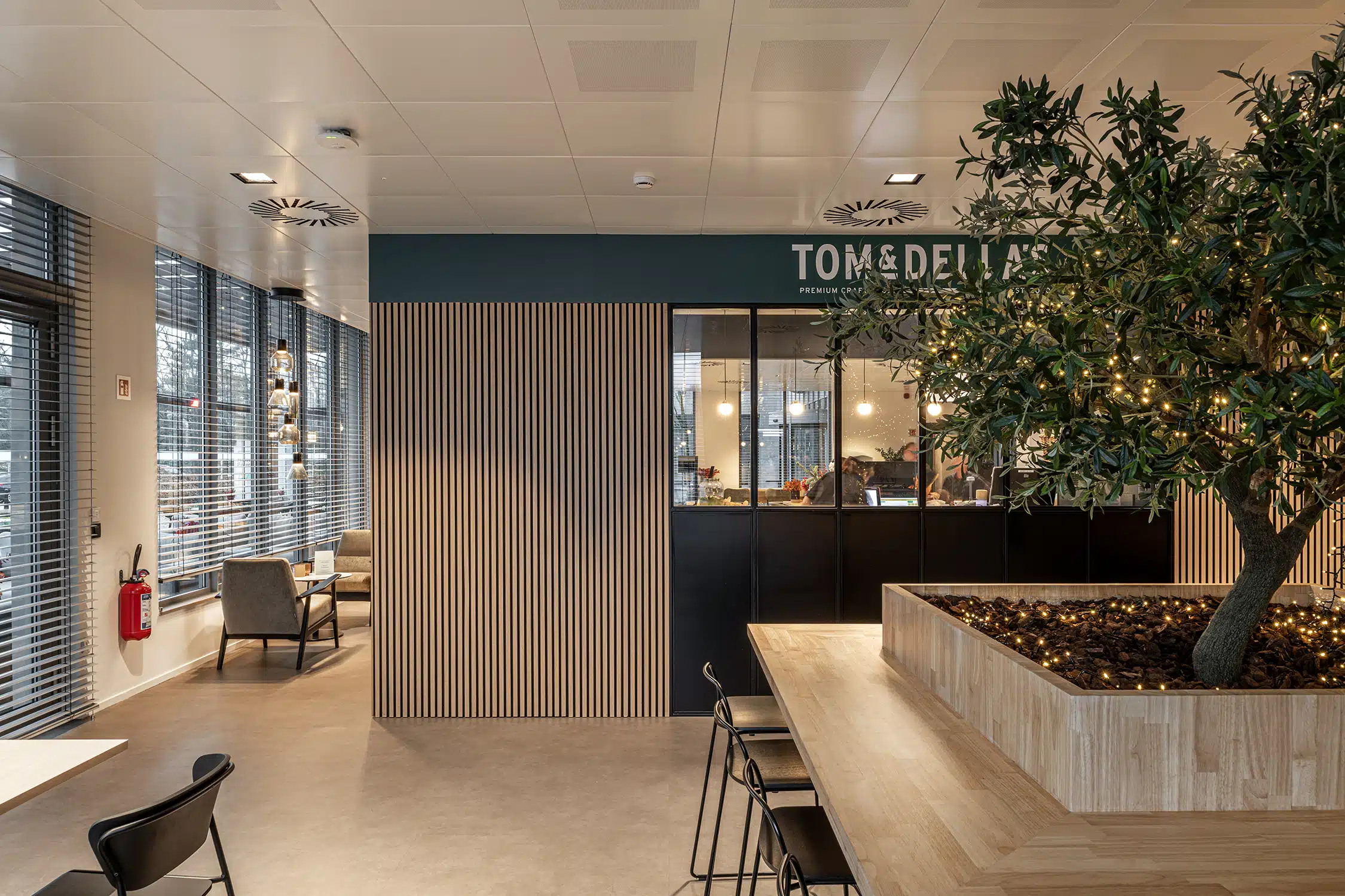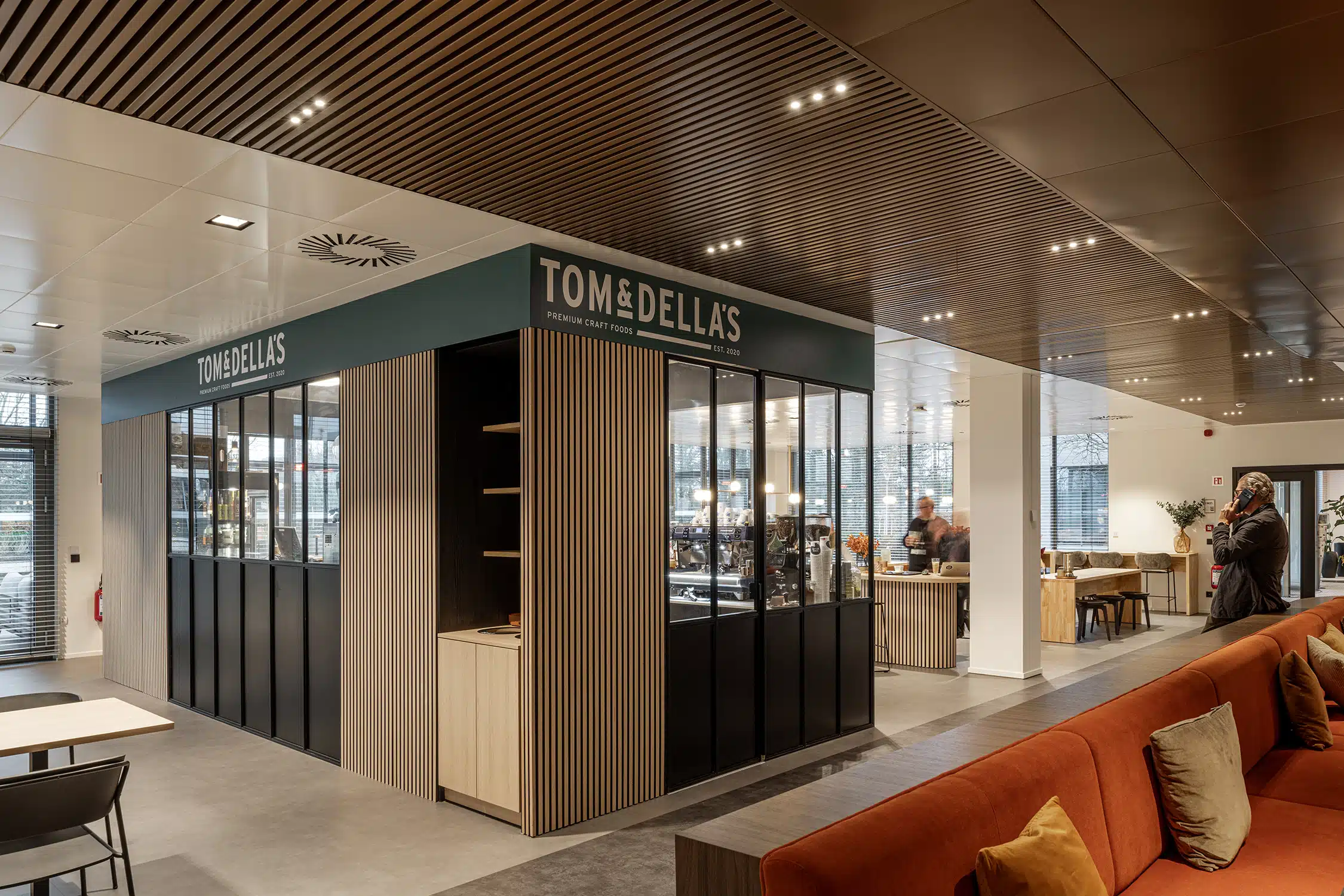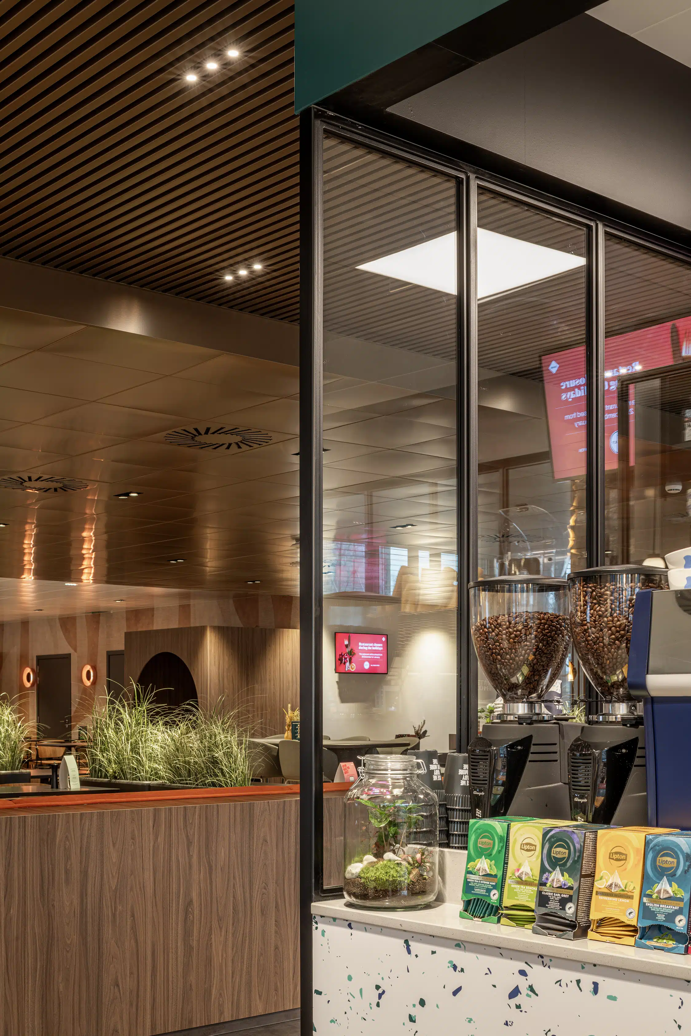 In het kantorencomplex “Hermes Plaza” werd de bestaande kantine opgewaardeerd tot een gezellig restaurant met Tom&Della’s koffiebar concept. De eerste zone grenzend aan de wintertuin is luchtig door de vele raampartijen en door gebruik van lichte houtsoorten en de toepassing van een wit systeemplafond. Centraal in deze zone staat onze Tom & Della’s koffiebar, een nieuw concept van Compass Group die wij mochten vormgeven. Aansluitend ontwierpen we een restaurant dat polyvalent gebruik omarmt, deze biedt een dynamische ervaring die verder gaat dan alleen dineren. Met een verscheidenheid aan zitzones, waaronder comfortabele zitbanken, intieme booths, high en low seating, kunnen gasten de sfeer kiezen die het beste bij hun gelegenheid past. Of het nu gaat om een casual lunch, een zakelijke meeting of een ontspannen koffiepauze, de restaurant zone is ontworpen om aan alle behoeften te voldoen. De toevoeging van goed uitgeruste meeting rooms maakt het restaurant een ideale locatie voor professionele bijeenkomsten, waarbij culinaire genoegens en productiviteit hand in hand gaan. Dit concept van een multifunctioneel restaurant weerspiegelt de hedendaagse trend van flexibele en gemengde ruimtes, waarbij functionaliteit en plezier naadloos samenvloeien.
