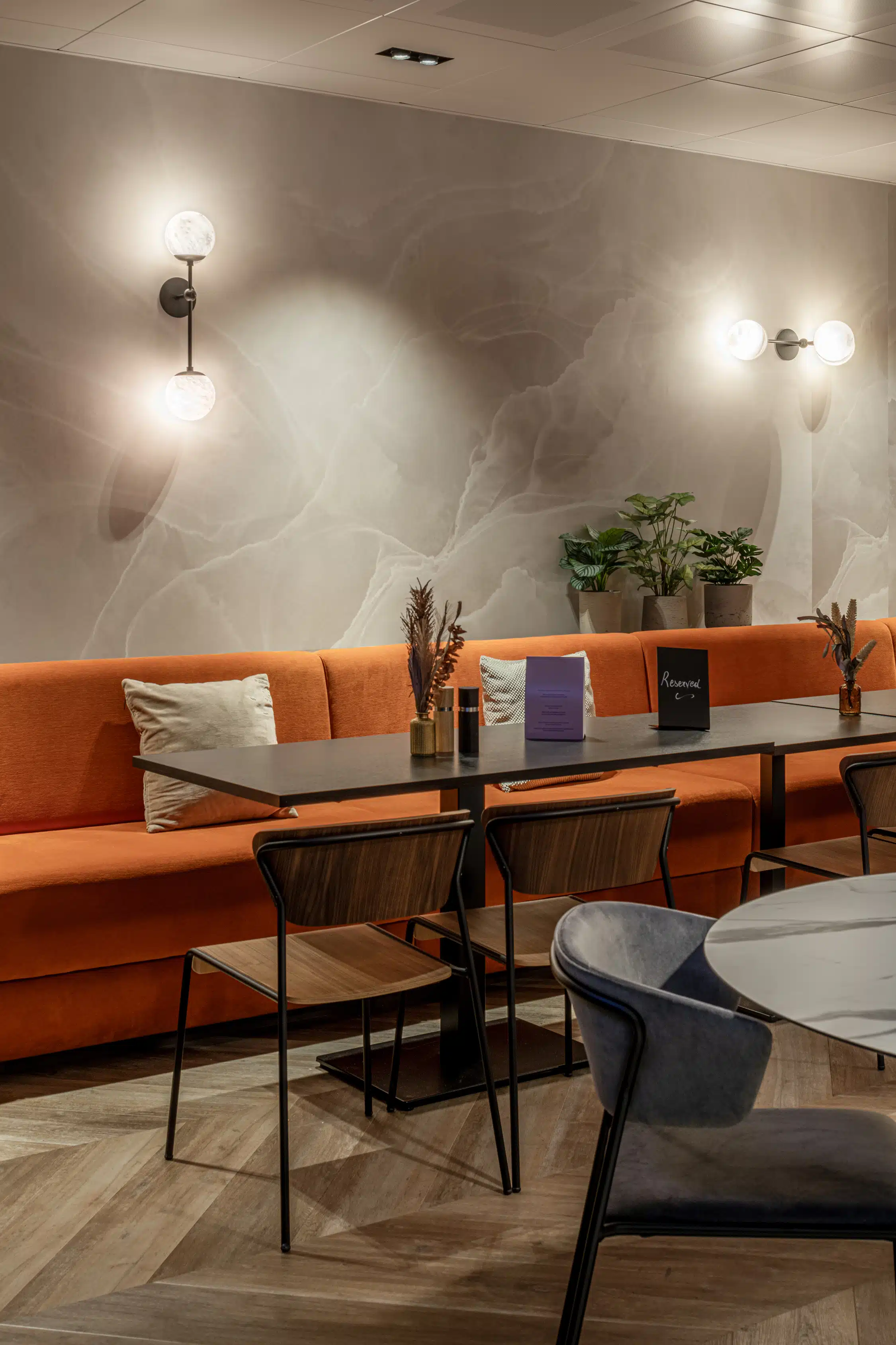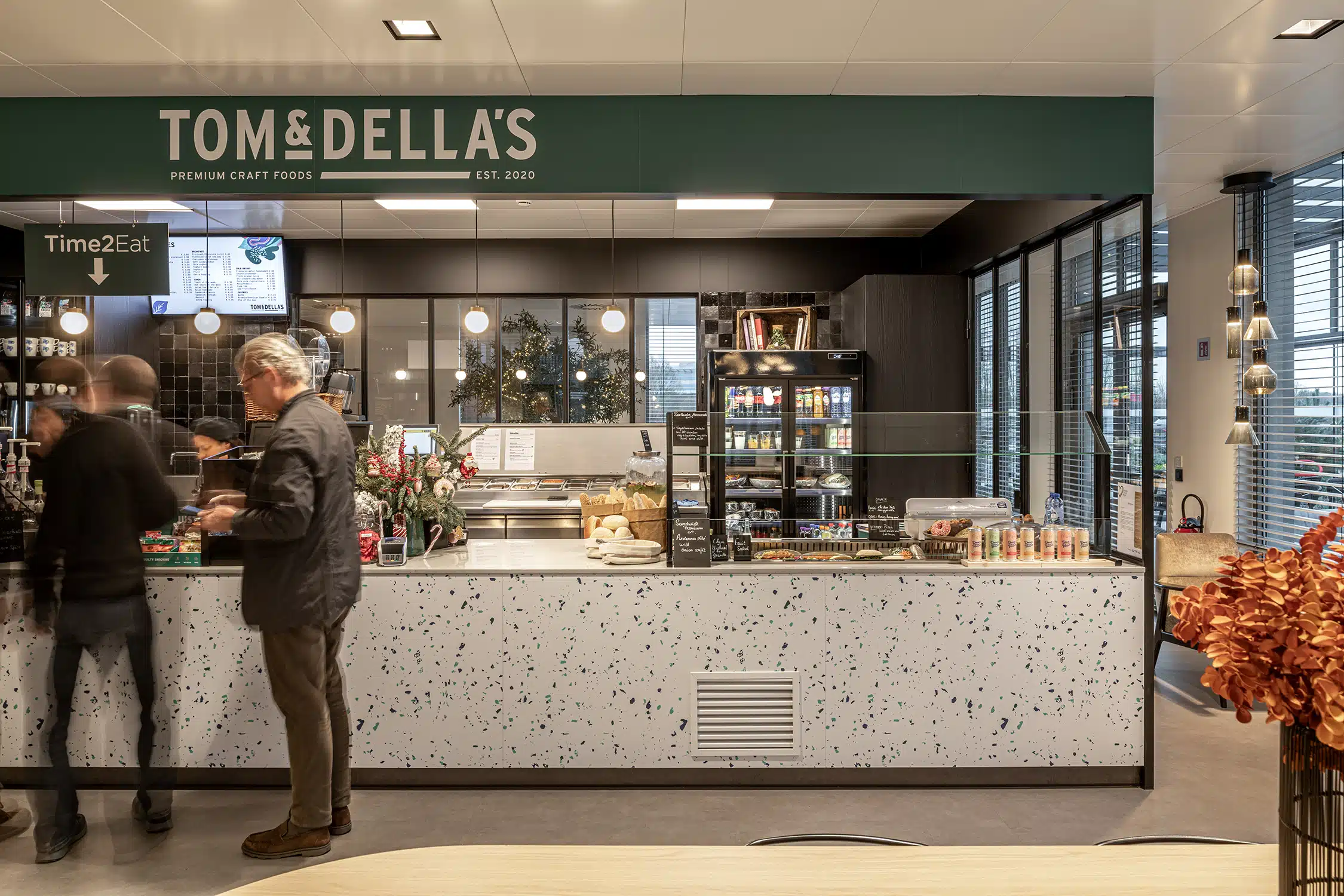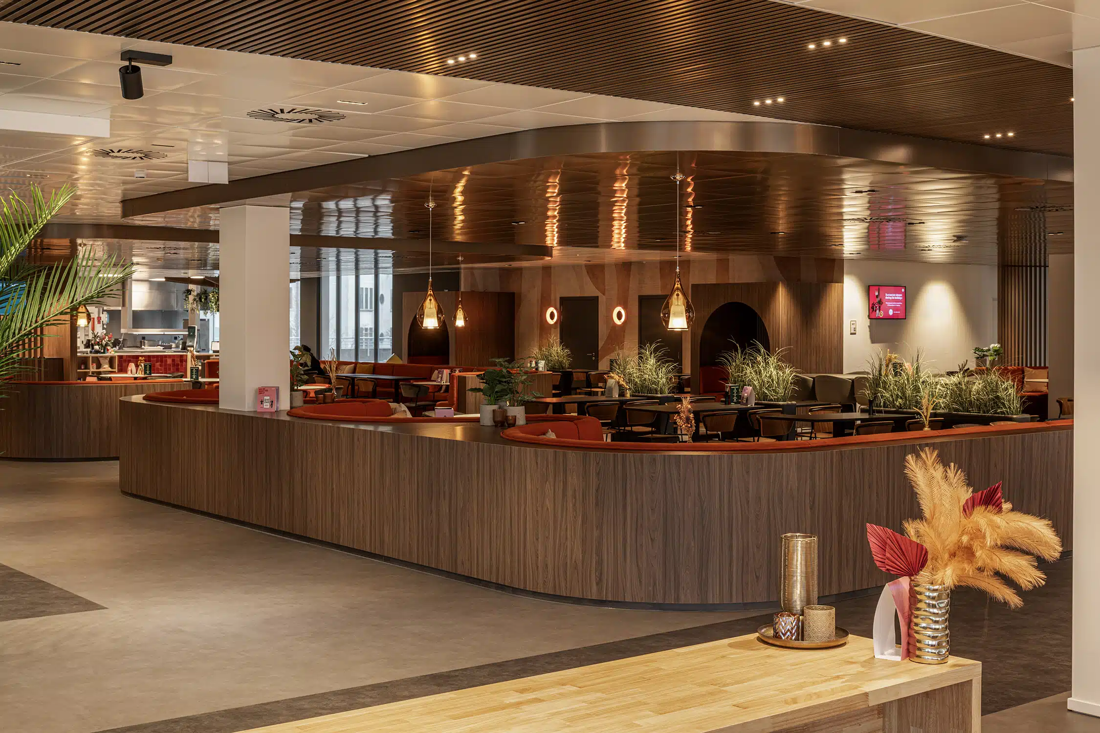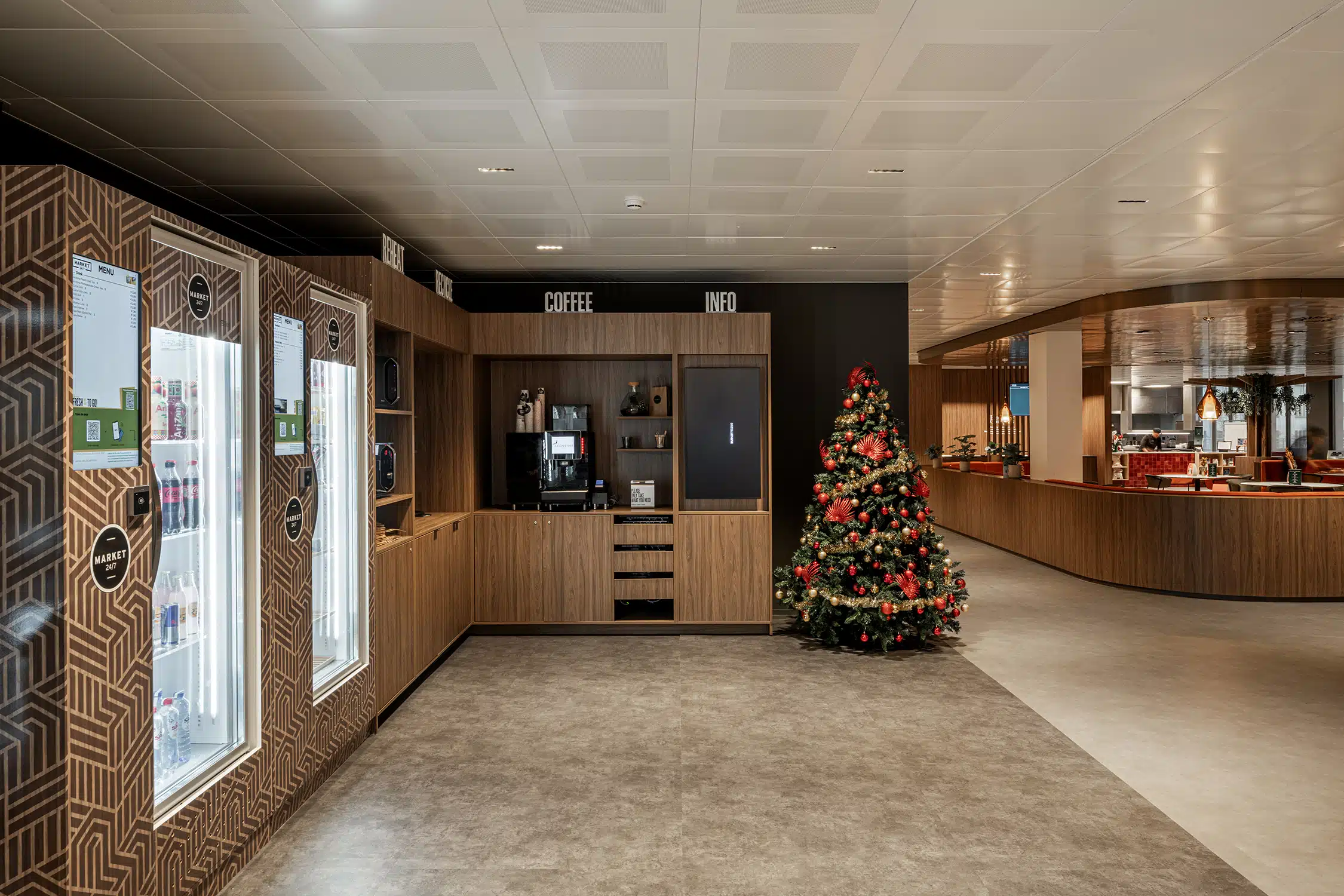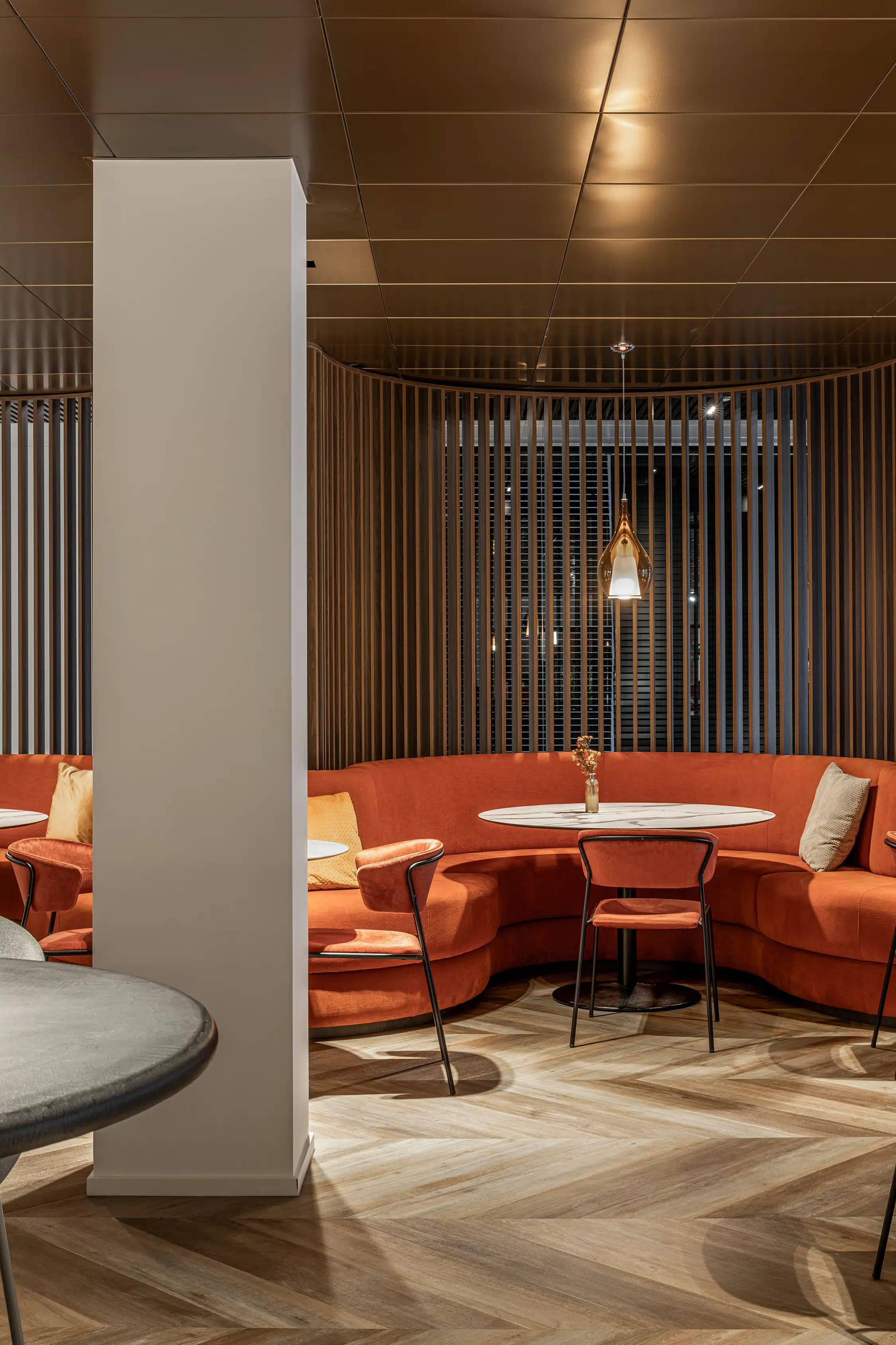 In het kantorencomplex “Hermes Plaza” werd de bestaande kantine opgewaardeerd tot een gezellig restaurant met Tom&Della’s koffiebar concept. De eerste zone grenzend aan de wintertuin is luchtig door de vele raampartijen en door gebruik van lichte houtsoorten en de toepassing van een wit systeemplafond. Centraal in deze zone staat onze Tom & Della’s koffiebar, een nieuw concept van Compass Group die wij mochten vormgeven. Aansluitend ontwierpen we een restaurant dat polyvalent gebruik omarmt, deze biedt een dynamische ervaring die verder gaat dan alleen dineren. Met een verscheidenheid aan zitzones, waaronder comfortabele zitbanken, intieme booths, high en low seating, kunnen gasten de sfeer kiezen die het beste bij hun gelegenheid past. Of het nu gaat om een casual lunch, een zakelijke meeting of een ontspannen koffiepauze, de restaurant zone is ontworpen om aan alle behoeften te voldoen. De toevoeging van goed uitgeruste meeting rooms maakt het restaurant een ideale locatie voor professionele bijeenkomsten, waarbij culinaire genoegens en productiviteit hand in hand gaan. Dit concept van een multifunctioneel restaurant weerspiegelt de hedendaagse trend van flexibele en gemengde ruimtes, waarbij functionaliteit en plezier naadloos samenvloeien.