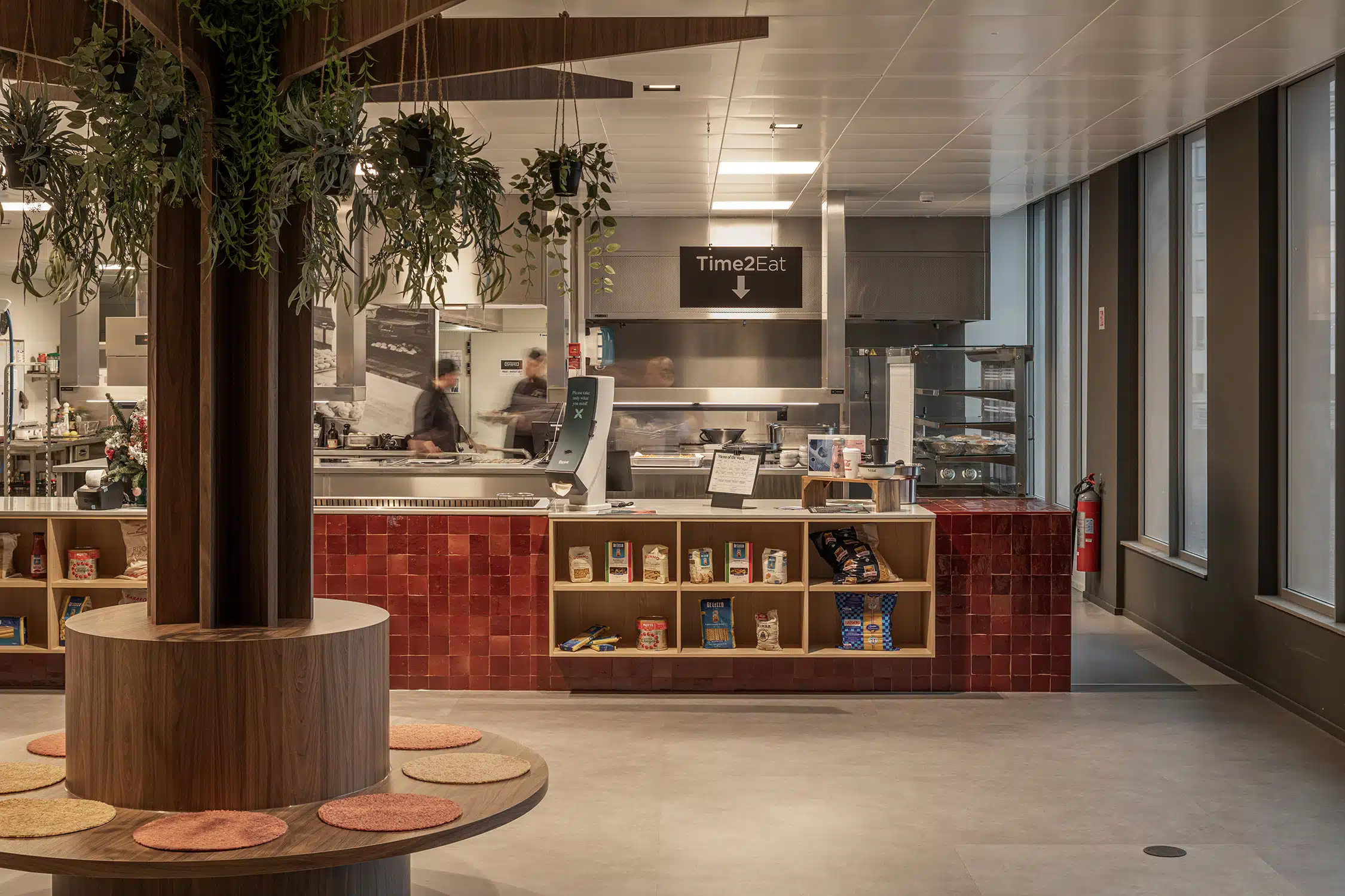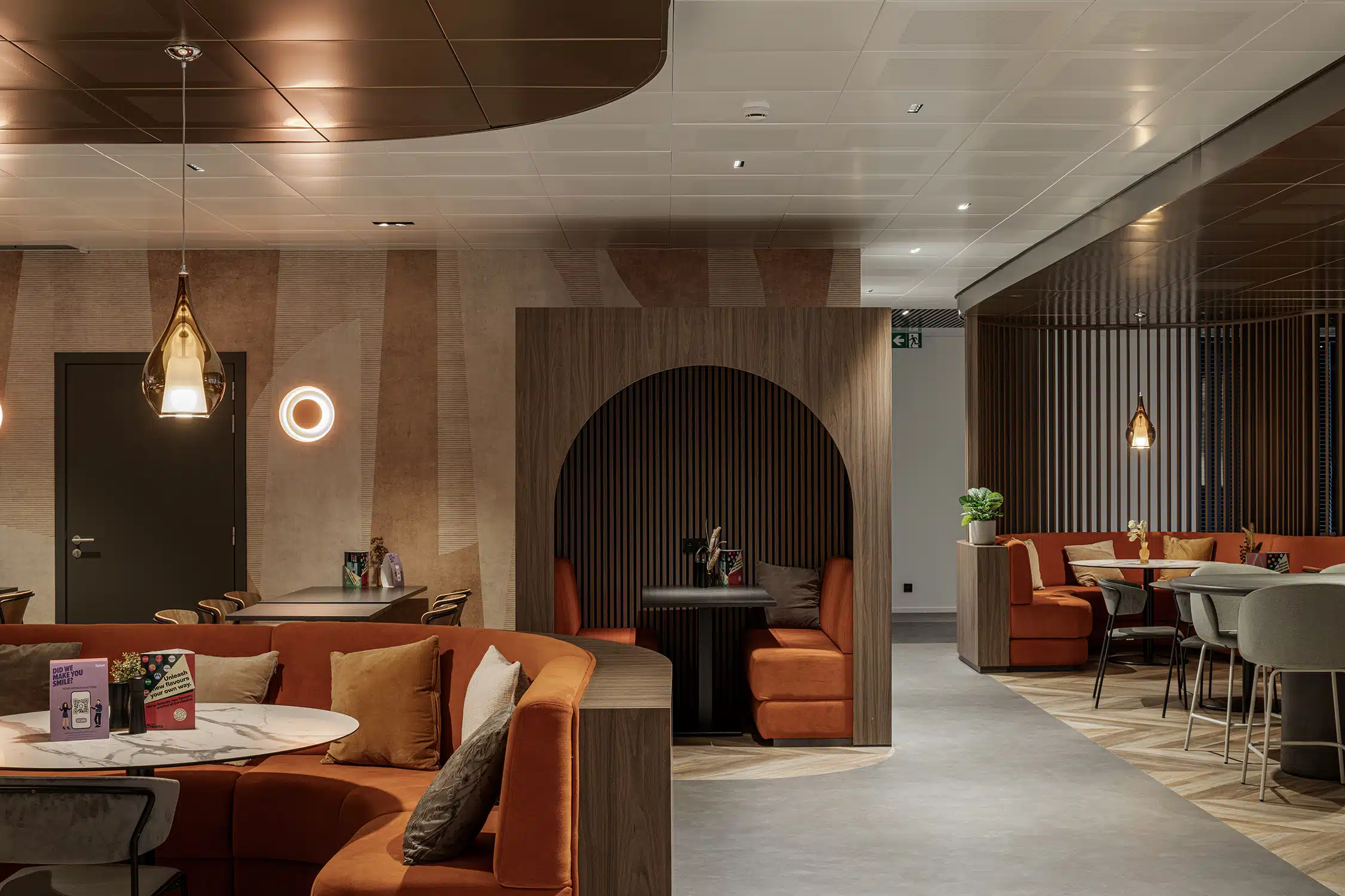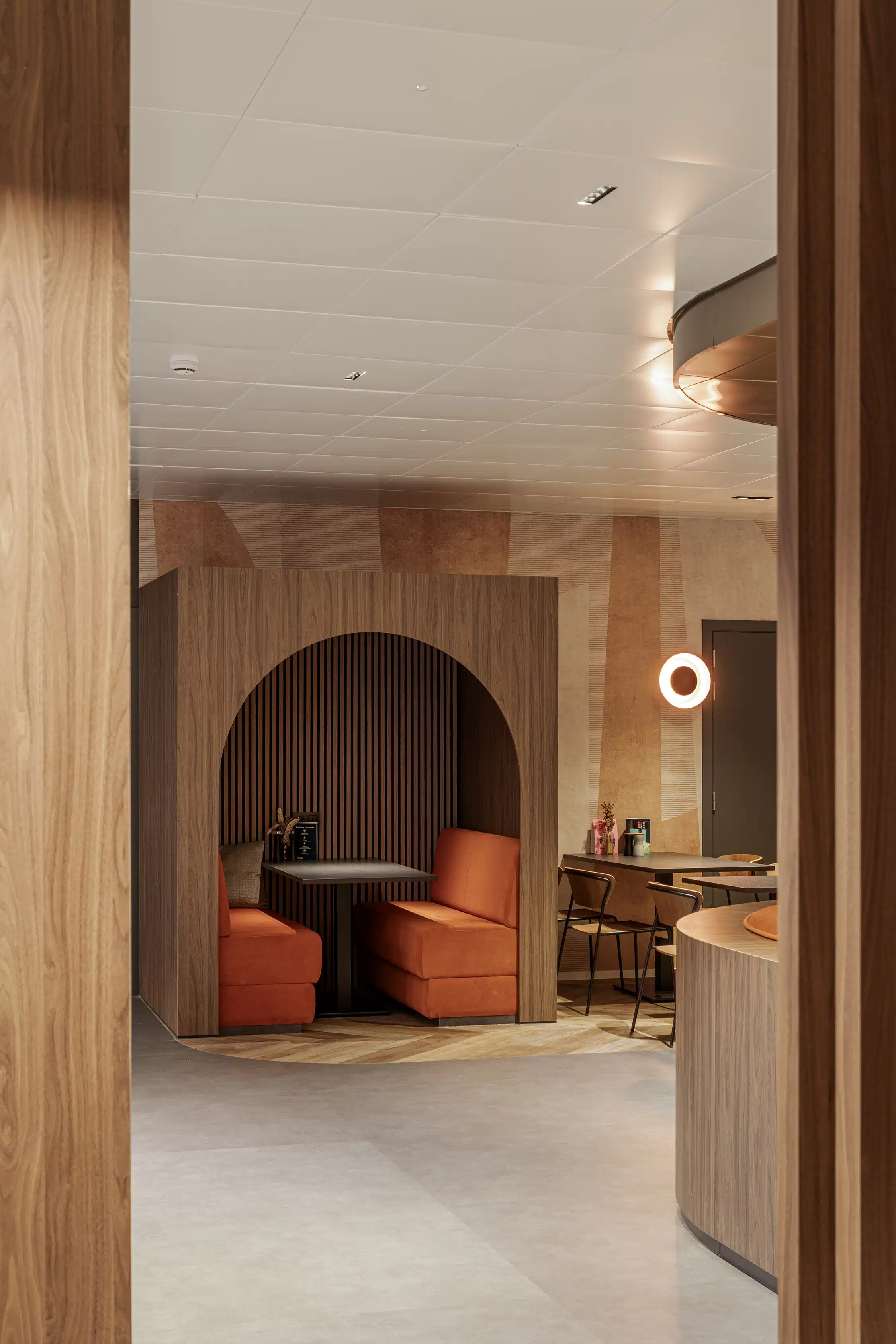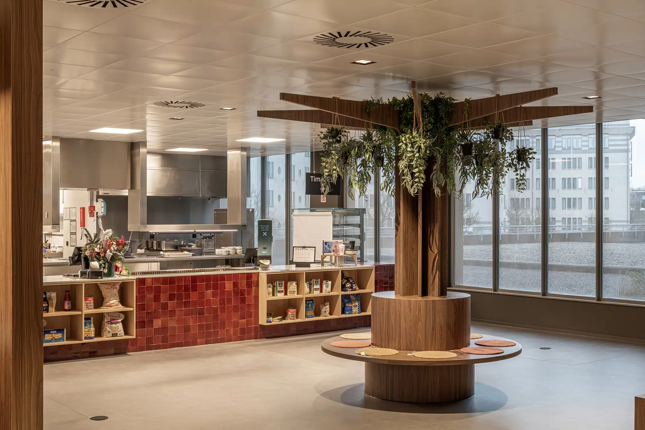 In het kantorencomplex “Hermes Plaza” werd de bestaande kantine opgewaardeerd tot een gezellig restaurant met Tom&Della’s koffiebar concept. De eerste zone grenzend aan de wintertuin is luchtig door de vele raampartijen en door gebruik van lichte houtsoorten en de toepassing van een wit systeemplafond. Centraal in deze zone staat onze Tom & Della’s koffiebar, een nieuw concept van Compass Group die wij mochten vormgeven. Aansluitend ontwierpen we een restaurant dat polyvalent gebruik omarmt, deze biedt een dynamische ervaring die verder gaat dan alleen dineren. Met een verscheidenheid aan zitzones, waaronder comfortabele zitbanken, intieme booths, high en low seating, kunnen gasten de sfeer kiezen die het beste bij hun gelegenheid past. Of het nu gaat om een casual lunch, een zakelijke meeting of een ontspannen koffiepauze, de restaurant zone is ontworpen om aan alle behoeften te voldoen. De toevoeging van goed uitgeruste meeting rooms maakt het restaurant een ideale locatie voor professionele bijeenkomsten, waarbij culinaire genoegens en productiviteit hand in hand gaan. Dit concept van een multifunctioneel restaurant weerspiegelt de hedendaagse trend van flexibele en gemengde ruimtes, waarbij functionaliteit en plezier naadloos samenvloeien.