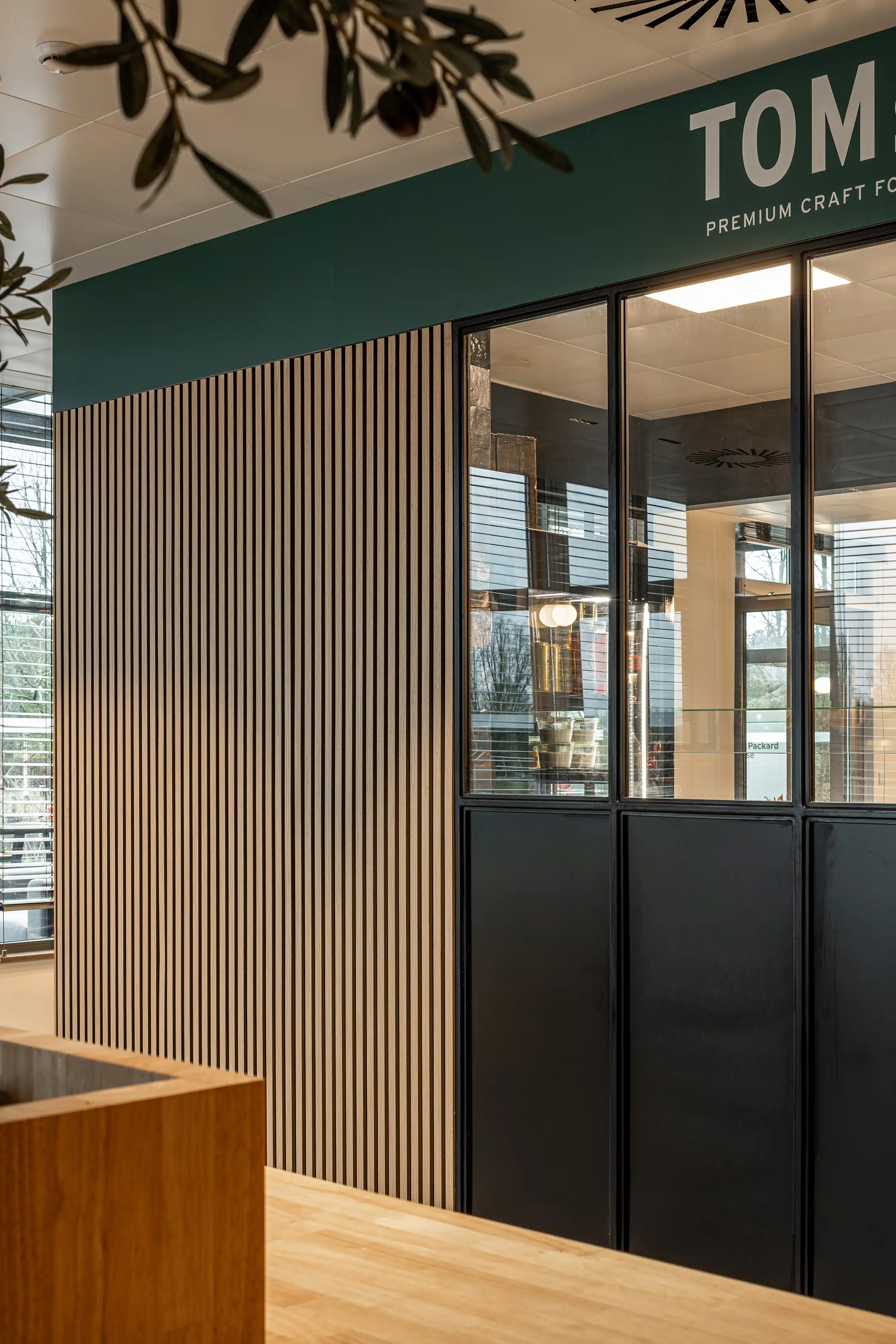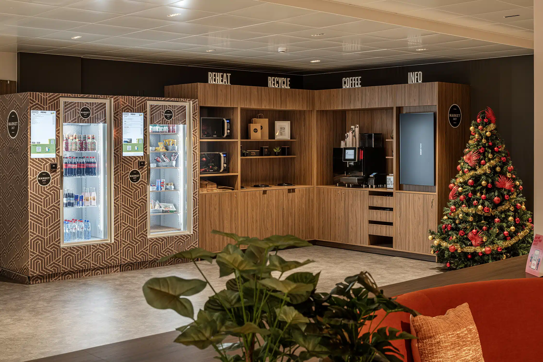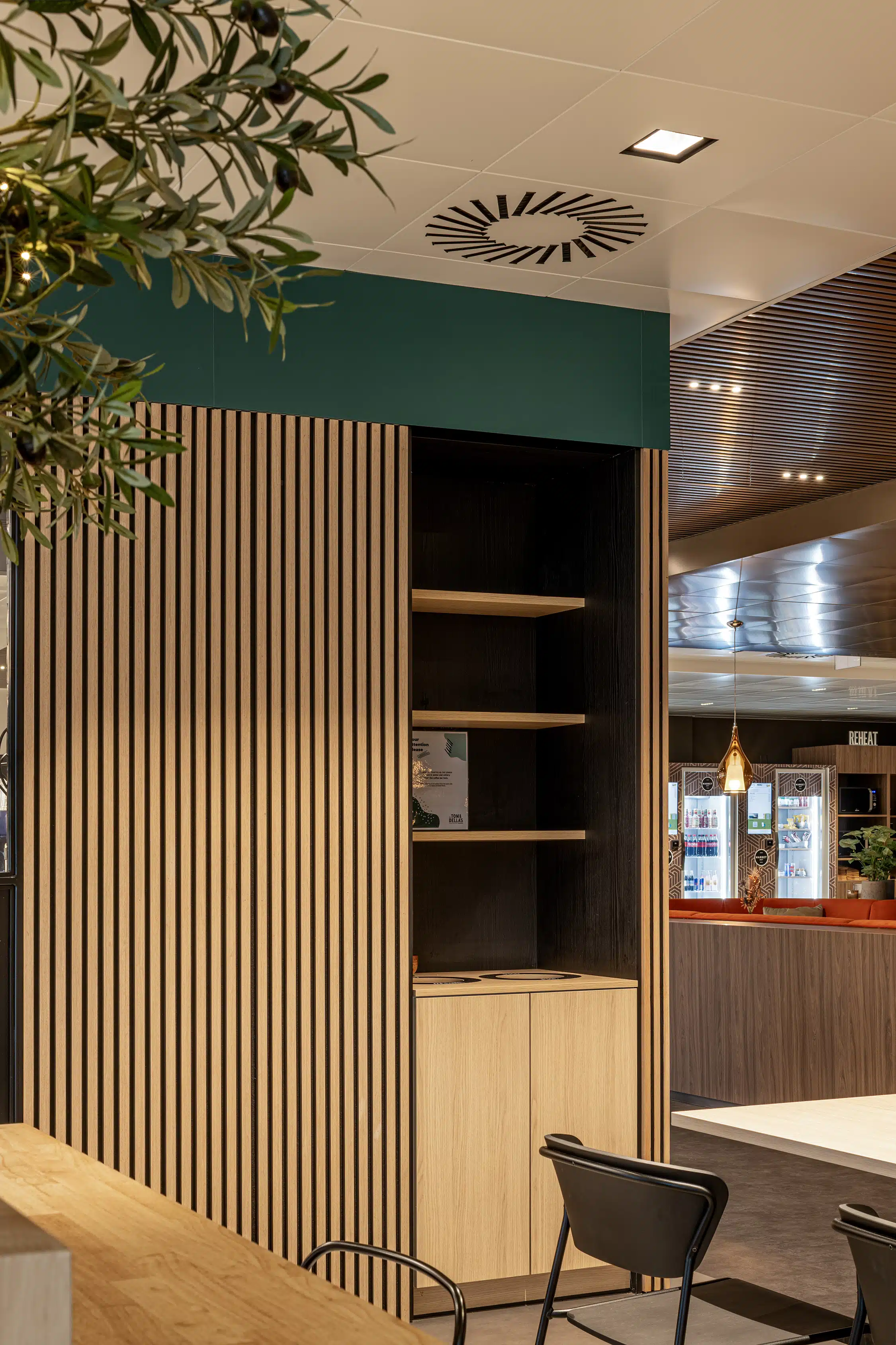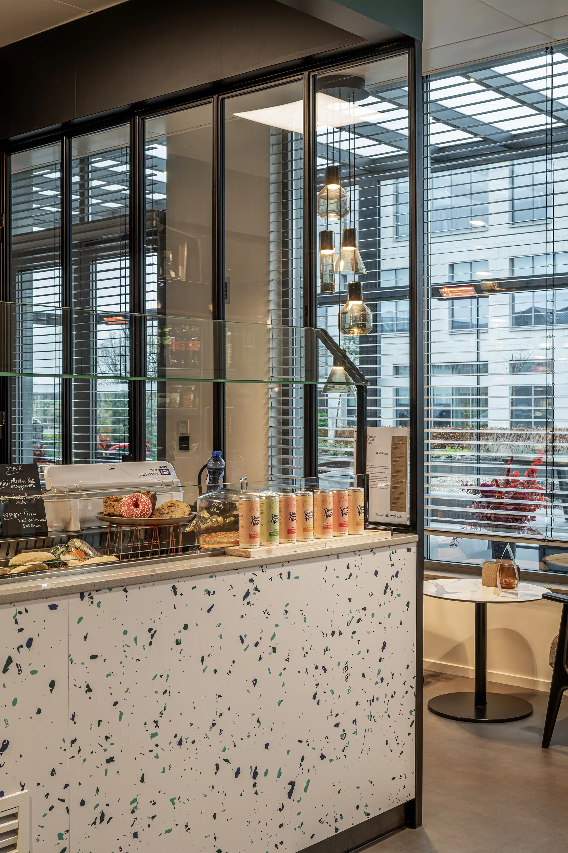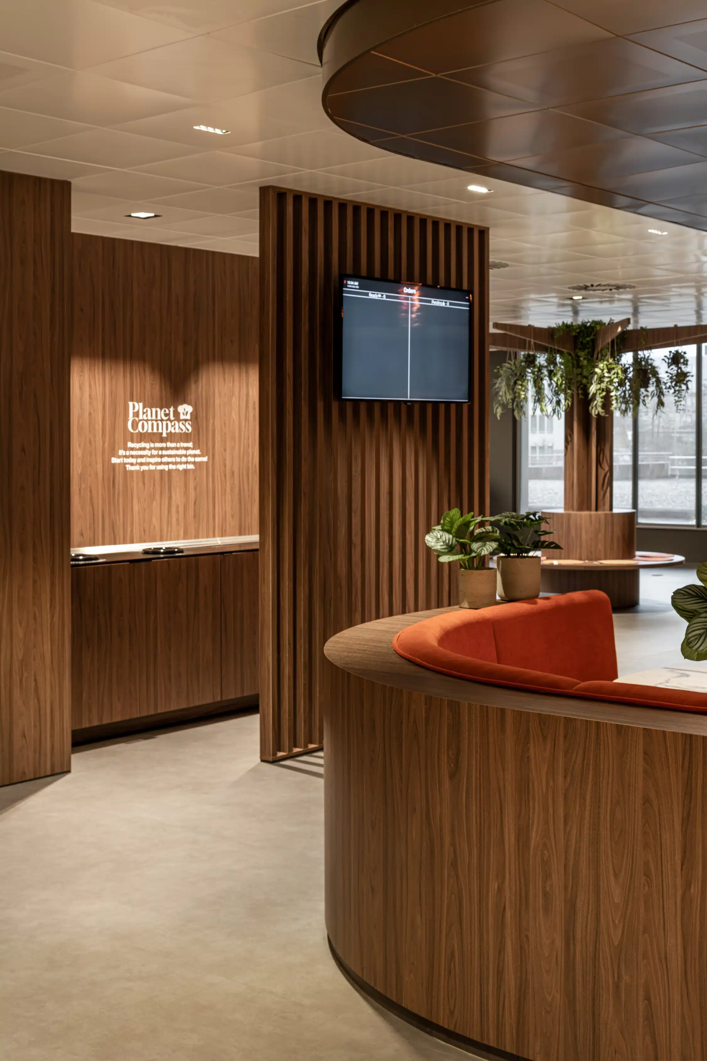 In het kantorencomplex “Hermes Plaza” werd de bestaande kantine opgewaardeerd tot een gezellig restaurant met Tom&Della’s koffiebar concept. De eerste zone grenzend aan de wintertuin is luchtig door de vele raampartijen en door gebruik van lichte houtsoorten en de toepassing van een wit systeemplafond. Centraal in deze zone staat onze Tom & Della’s koffiebar, een nieuw concept van Compass Group die wij mochten vormgeven. Aansluitend ontwierpen we een restaurant dat polyvalent gebruik omarmt, deze biedt een dynamische ervaring die verder gaat dan alleen dineren. Met een verscheidenheid aan zitzones, waaronder comfortabele zitbanken, intieme booths, high en low seating, kunnen gasten de sfeer kiezen die het beste bij hun gelegenheid past. Of het nu gaat om een casual lunch, een zakelijke meeting of een ontspannen koffiepauze, de restaurant zone is ontworpen om aan alle behoeften te voldoen. De toevoeging van goed uitgeruste meeting rooms maakt het restaurant een ideale locatie voor professionele bijeenkomsten, waarbij culinaire genoegens en productiviteit hand in hand gaan. Dit concept van een multifunctioneel restaurant weerspiegelt de hedendaagse trend van flexibele en gemengde ruimtes, waarbij functionaliteit en plezier naadloos samenvloeien.